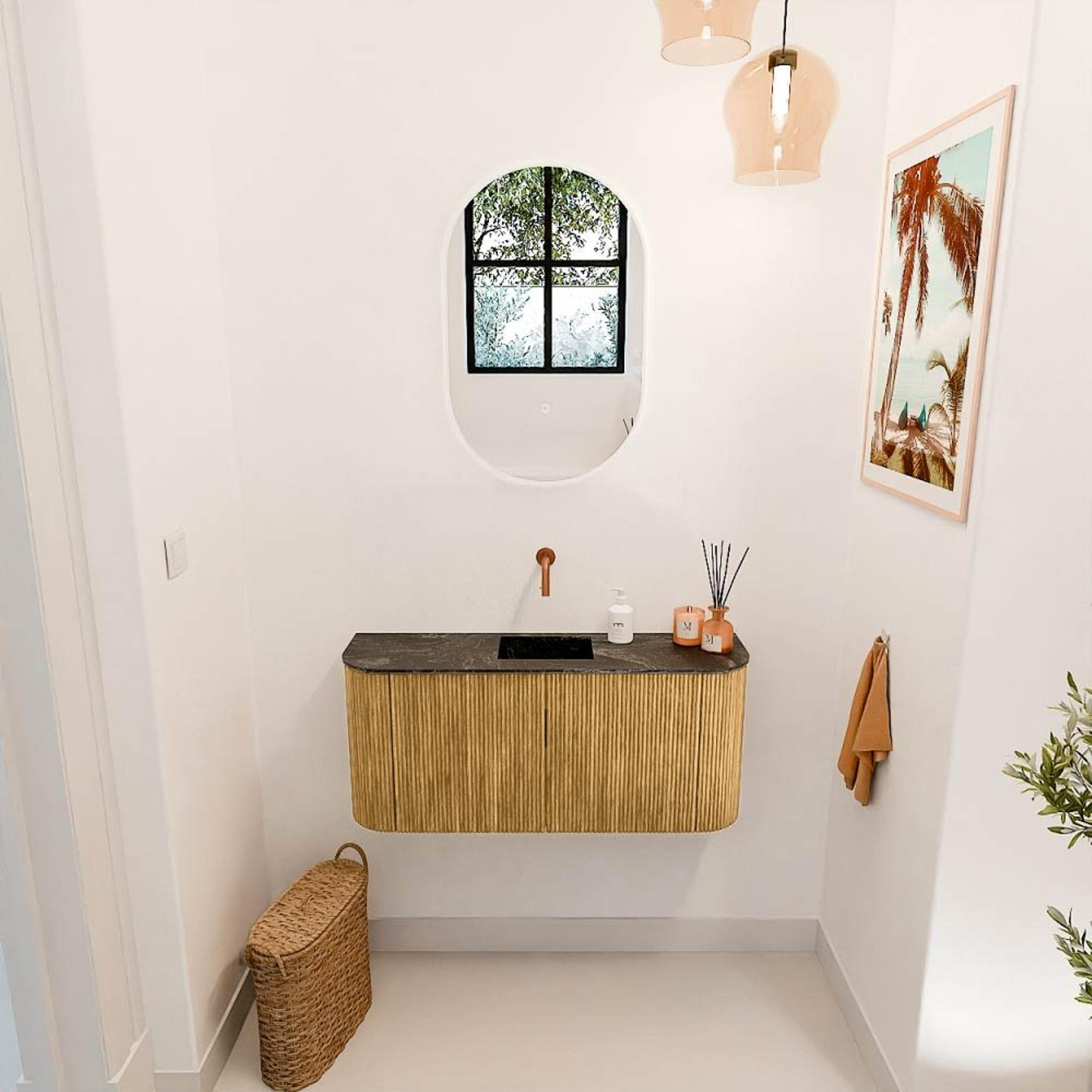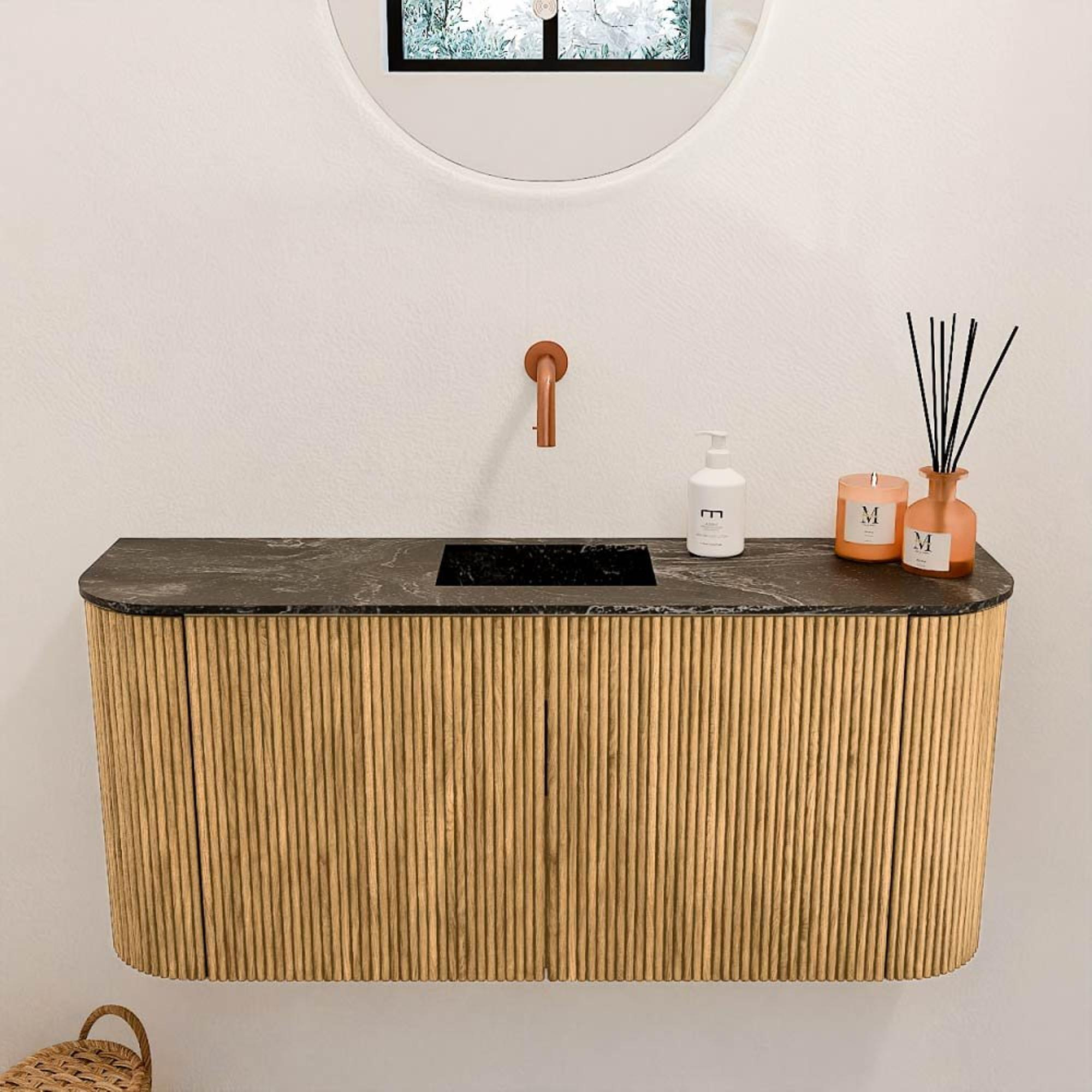 Met dit prachtige meubel geef je jouw badkamer direct een warme en natuurlijke uitstraling. Het combineert een strak, modern design met de tijdloze charme van eikenhout, waardoor het een echte blikvanger wordt. Dankzij de subtiele rondingen aan zowel de linker- als rechterzijde voelt het meubel uitnodigend en zacht aan, terwijl het toch een krachtige presence heeft. De wastafel is centraal geplaatst en zonder kraangat, wat je de vrijheid geeft om zelf de kraan te kiezen die het beste bij jouw stijl en wensen past. Dit meubel is niet alleen een lust voor het oog, maar ook uiterst praktisch dankzij de slimme afmetingen en het ruimtebesparende ontwerp. Zo geniet je van een badkamer die niet alleen mooi oogt, maar ook functioneel en comfortabel is in gebruik.