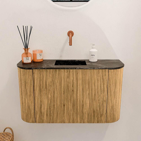 Het meubel valt direct op door zijn elegante eikenhouten front en de subtiele rondingen aan beide kanten. Deze natuurlijke houtkleur geeft warmte en karakter aan je badkamer, waardoor het een uitnodigende plek wordt. De lava-kleurige wastafel vormt een mooi contrast en voegt een moderne twist toe. Door het strakke design en de hoogwaardige materialen past dit meubel perfect in zowel klassieke als eigentijdse badkamers. Zo creëer je een harmonieuze sfeer die je elke dag weer inspireert.