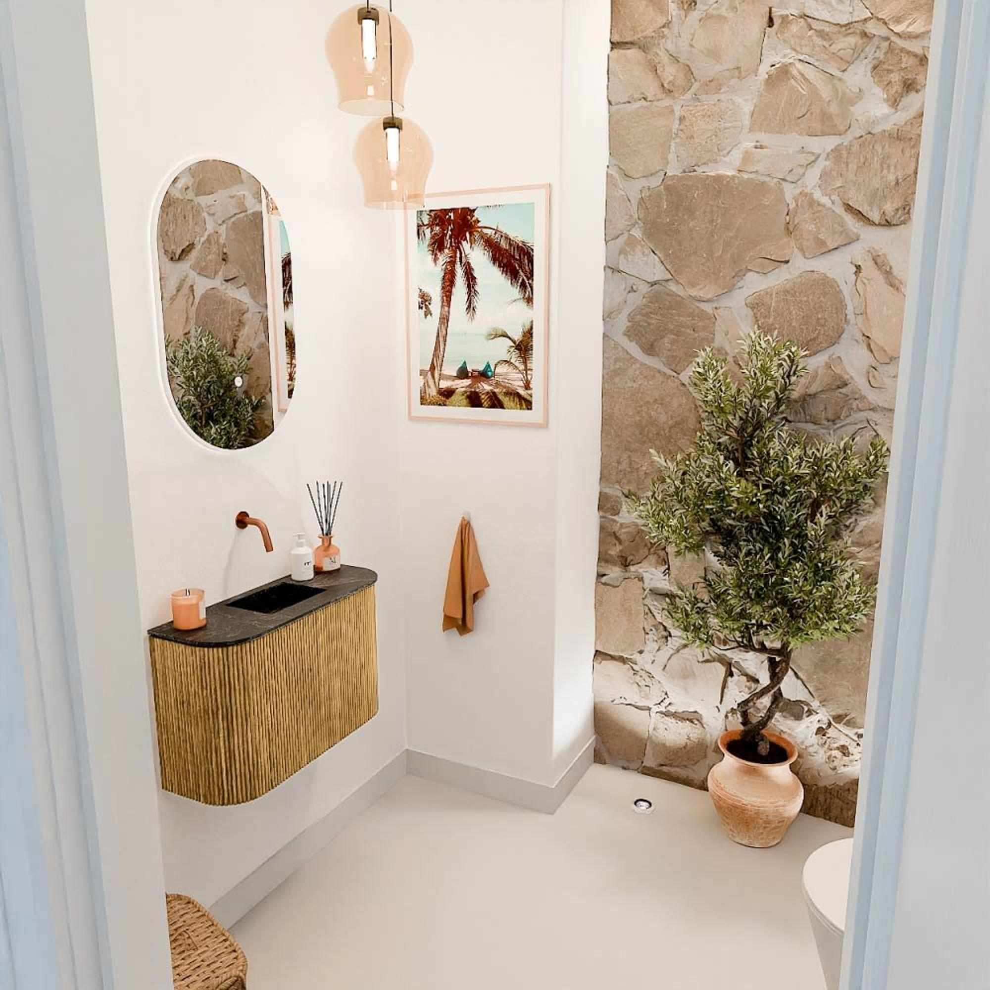Met dit prachtige meubel geef je jouw toilet of compacte badkamer direct een stijlvolle en warme uitstraling. Het combineert de natuurlijke charme van eikenhout met een modern, afgerond design aan beide zijden, waardoor het niet alleen een blikvanger is, maar ook perfect past in kleinere ruimtes. De wastafel in lava-kleur voegt een stoer contrast toe en is centraal gepositioneerd, wat zorgt voor een evenwichtige en harmonieuze look. Dankzij de slimme afmetingen en het wandmontage-systeem creëer je eenvoudig extra vloeroppervlak, wat de ruimte luchtiger en ruimer doet aanvoelen. Dit meubel brengt niet alleen sfeer, maar ook praktische voordelen, zoals een soft-close deur die geruisloos sluit en een push-to-open functie voor extra gebruiksgemak. Zo geniet je elke dag van een opgeruimde en verzorgde badkameromgeving die aanvoelt als een klein wellnessmoment.