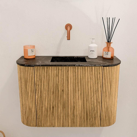De combinatie van massief eikenhout aan de voorkant en eikenfineer aan de zijkanten geeft dit meubel een natuurlijke en luxe uitstraling. De subtiele rondingen aan de linker- en rechterkant zorgen voor een zacht en uitnodigend design dat zich moeiteloos aanpast aan verschillende interieurstijlen. De verticale groeven op de deur voegen een verfijnd detail toe dat het meubel een eigentijdse twist geeft. Zo haal je niet zomaar een kast in huis, maar een stijlvol element dat jouw badkamer een warme en persoonlijke sfeer geeft.