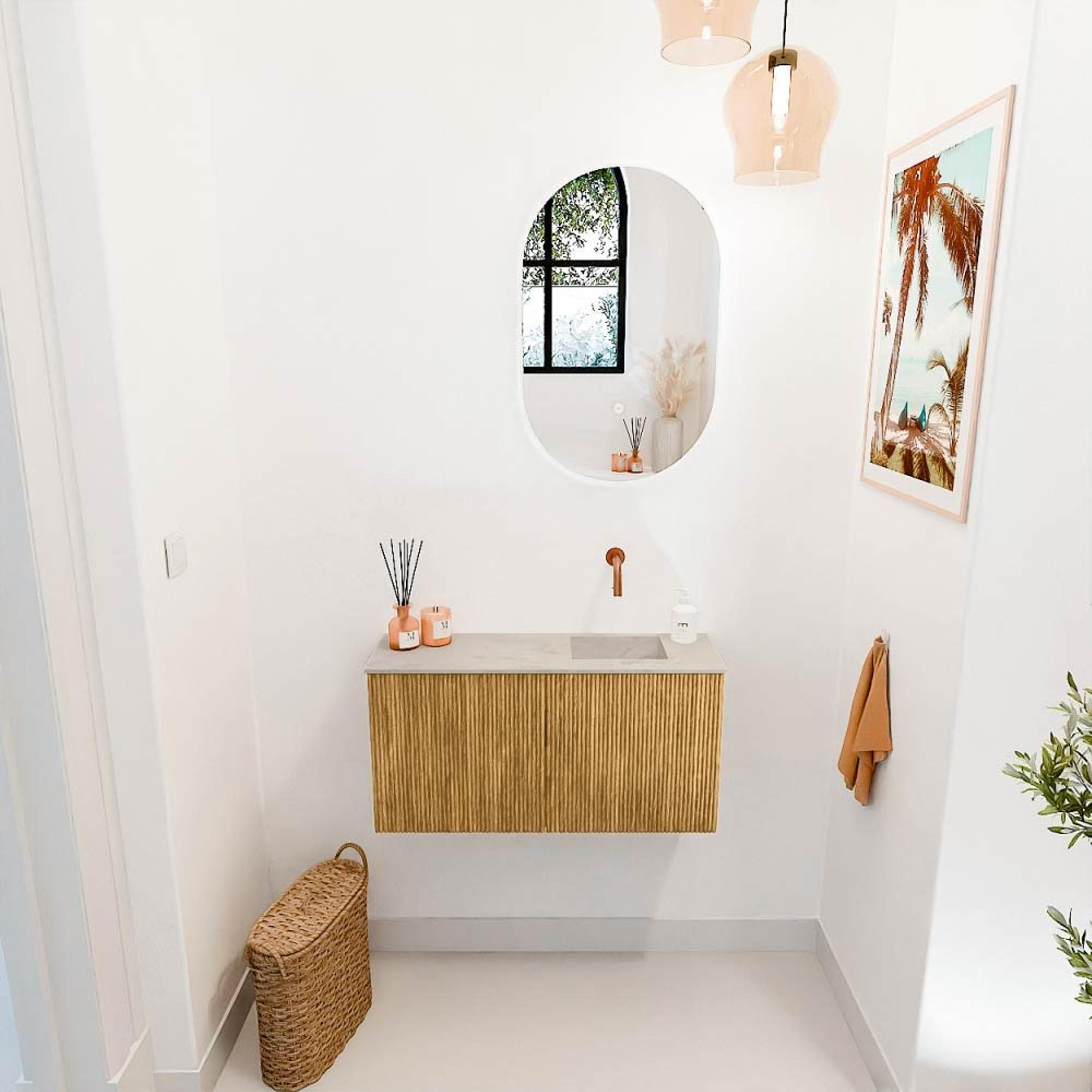 Met dit prachtige meubel geef je jouw badkamer direct een warme en natuurlijke uitstraling. Het combineert de tijdloze charme van eikenhout met een strak, modern design dat perfect past in vrijwel elke badkamerstijl. Dankzij de slimme afmetingen van 80 cm breed en de praktische wandmontage benut je de ruimte optimaal, wat vooral in kleinere badkamers of toiletruimtes een groot voordeel is. De wastafel, subtiel geplaatst aan de rechterkant zonder kraangat, biedt je de vrijheid om zelf de kraan te kiezen die het beste bij jouw wensen past. De zachte kleur Opalo van de wastafel zorgt voor een frisse, lichte uitstraling die mooi contrasteert met het warme eikenhout. Dit meubel is niet alleen een lust voor het oog, maar ook een waardevolle toevoeging die jouw dagelijkse routine aangenamer en georganiseerder maakt.