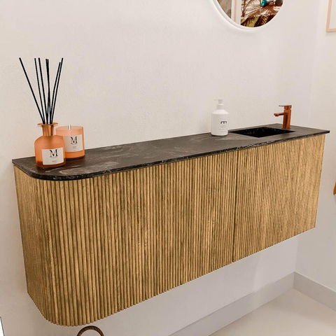 De natuurlijke eikenhouten afwerking geeft het meubel een warme en uitnodigende uitstraling die moeiteloos aansluit bij diverse badkamerstijlen. Door de subtiele ronding aan de linkerkant krijgt het meubel een uniek karakter, waardoor het een echte blikvanger wordt. De combinatie van massief eikenhout aan de voorkant en eikenfineer aan de zijkanten zorgt voor een verfijnde en hoogwaardige look. Zo voeg je niet alleen een functioneel element toe, maar ook een stijlvol pronkstuk dat jouw badkamer naar een hoger niveau tilt.