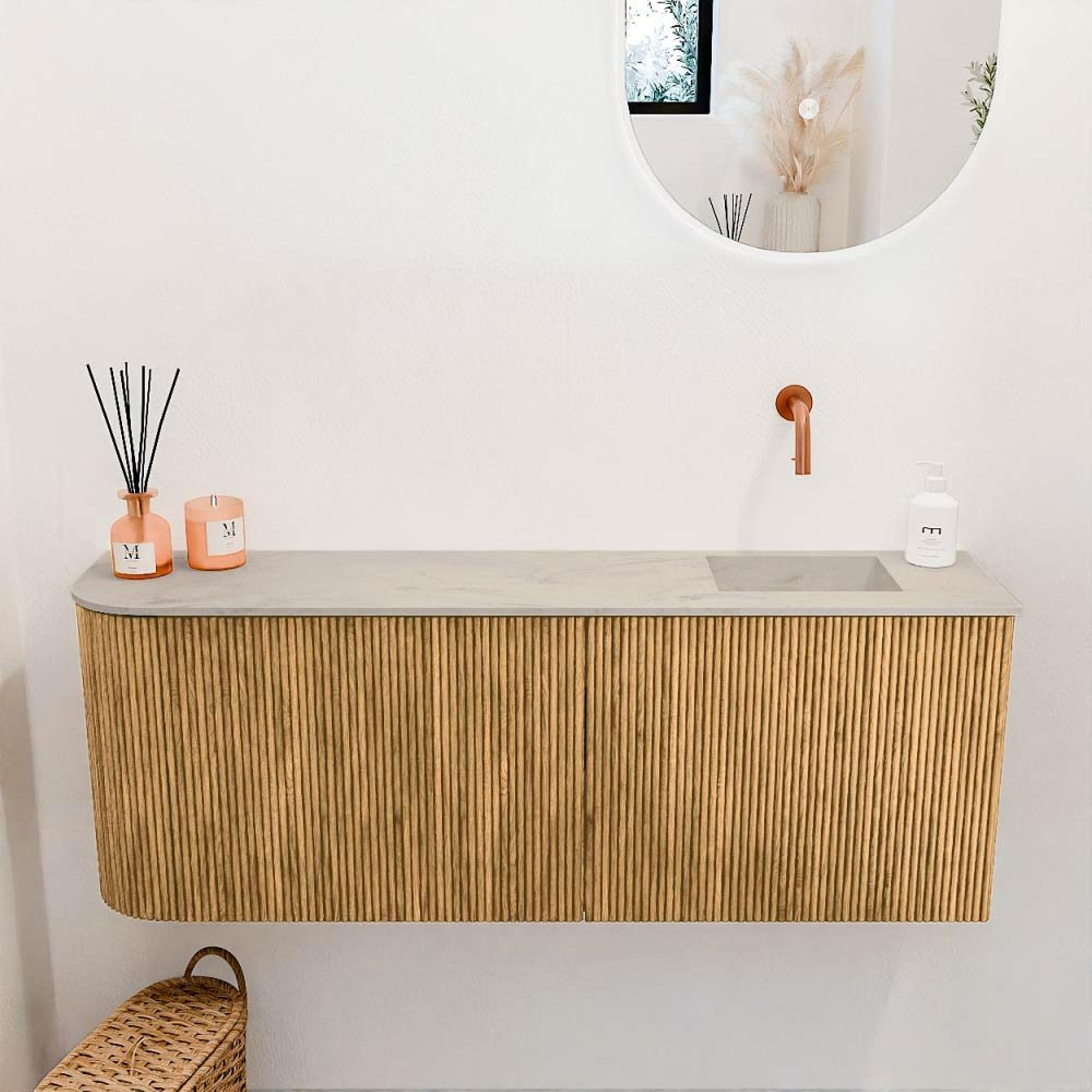 Met dit prachtige meubel geef je jouw badkamer direct een stijlvolle en warme uitstraling. Het combineert de natuurlijke charme van massief eikenhout met een modern design dat perfect aansluit bij diverse interieurstijlen. Dankzij de subtiele ronding aan de linkerkant en de verticale ribbelstructuur op het eikenhout, krijgt je badkamer een unieke en verfijnde look. Het meubel is niet alleen een lust voor het oog, maar ook uiterst praktisch. De royale afmetingen bieden voldoende opbergruimte om je badkamer netjes en overzichtelijk te houden. De bijgeleverde wastafel in een zachte Opalo-kleur zorgt voor een frisse en lichte touch, terwijl de positie aan de rechterkant het gebruiksgemak verhoogt. Dit meubel is een waardevolle toevoeging die jouw badkamer transformeert tot een plek waar je elke dag met plezier begint en eindigt.