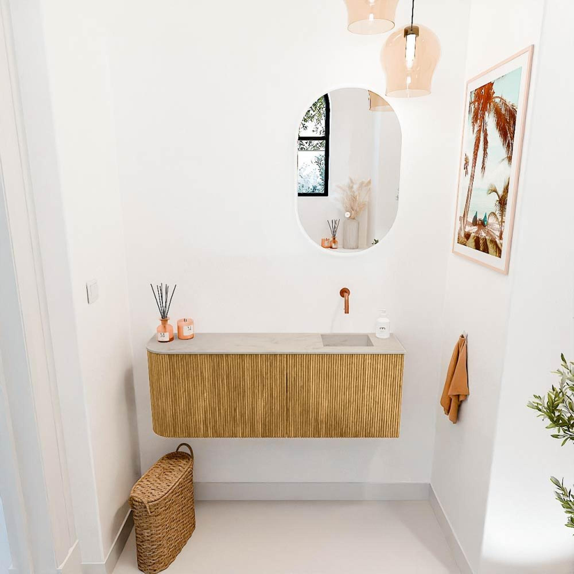 De combinatie van massief eikenhout en eikenfineer geeft dit meubel een natuurlijke en luxe uitstraling die direct opvalt. De verticale ribbelstructuur op de fronten voegt een subtiel speels element toe, waardoor het meubel zowel modern als tijdloos oogt. De afgeronde hoek aan de linkerkant maakt het ontwerp uniek en zorgt voor een zachte, uitnodigende uitstraling. Zo creëer je een badkamer die niet alleen functioneel is, maar ook een echte eyecatcher vormt. Met dit meubel haal je een stijlvol pronkstuk in huis dat moeiteloos past bij verschillende badkamerstijlen, van klassiek tot eigentijds.