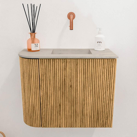 Het meubel valt direct op door zijn stijlvolle design met een zachte ronding aan de linkerkant en verticale groeven die het geheel een exclusieve uitstraling geven. De combinatie van massief eikenhout en eikenfineer zorgt voor een warme, natuurlijke look die tegelijkertijd modern oogt. Deze verfijnde details maken het meubel tot een echte blikvanger in jouw badkamer of toiletruimte. Dankzij de hoogwaardige afwerking behoudt het meubel zijn charme en elegantie, zelfs bij intensief gebruik.