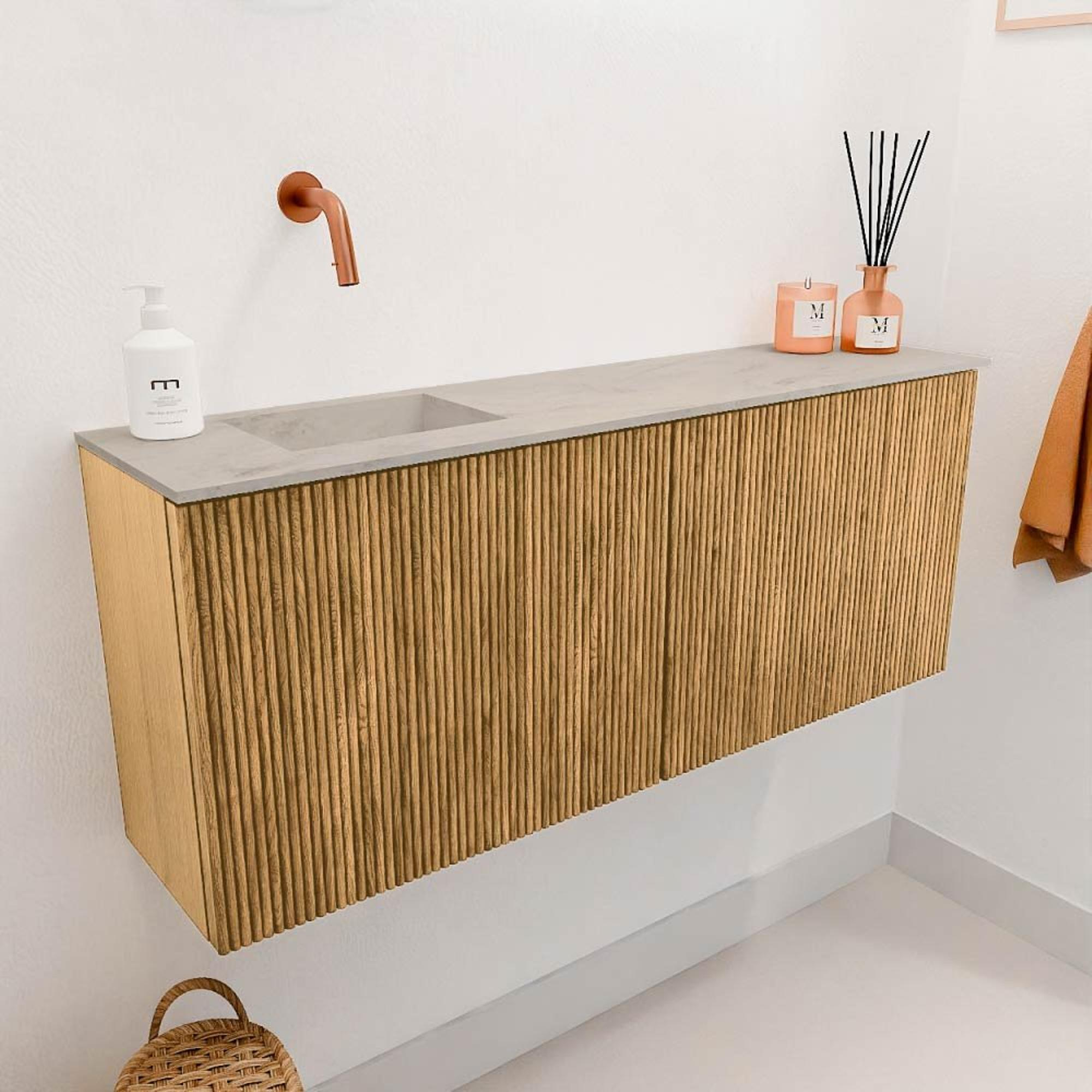 Breng een warme en natuurlijke sfeer in je badkamer met dit prachtige meubel dat perfect combineert met moderne functionaliteit. Het meubel straalt rust en elegantie uit dankzij het gebruik van hoogwaardig eikenhout, dat niet alleen duurzaam is maar ook een tijdloze uitstraling heeft. De subtiele verticale ribbelstructuur op de fronten geeft het geheel een speels doch verfijnd karakter, waardoor jouw badkamer direct een upgrade krijgt. De geïntegreerde wastafel in een zachte Opalo-kleur voegt een frisse, lichte touch toe zonder te overheersen. Dankzij de slimme indeling en het praktische formaat van 100 cm breed, past dit meubel uitstekend in zowel kleinere toiletruimtes als in grotere badkamers waar je een extra meubel wilt plaatsen. De zachte sluiting van de deuren zorgt voor een geruisloze ervaring en voorkomt slijtage, zodat je jarenlang plezier hebt van dit meubel. Zonder kraangat op de wastafel kun je zelf kiezen welke kraan het beste bij jouw stijl en wensen past, wat extra vrijheid geeft in de afwerking. Kortom, dit meubel is een ideale combinatie van natuurlijke materialen, doordacht design en praktische details die jouw badkamer compleet maken.