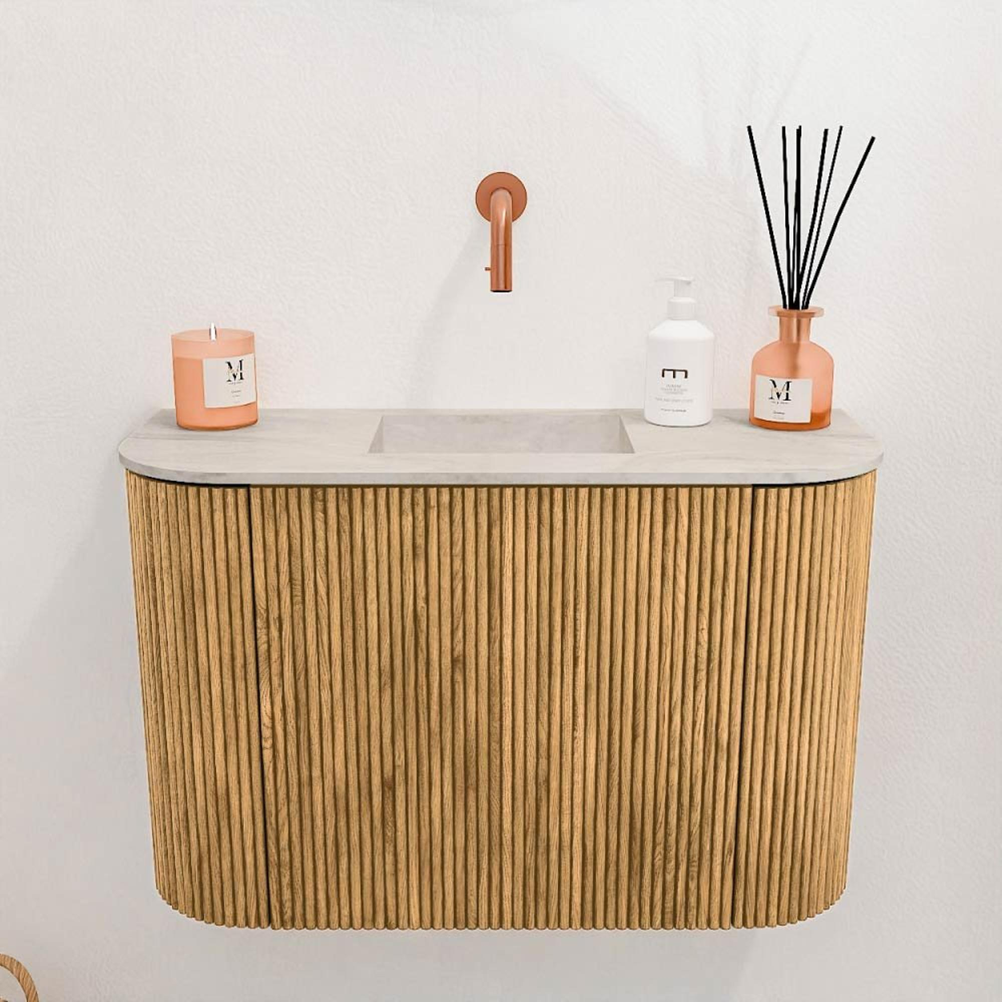 De verticale groeven in het front geven het meubel een moderne en elegante uitstraling die moeiteloos past in uiteenlopende badkamerstijlen. De warme eikenhoutkleur zorgt voor een natuurlijke sfeer, terwijl de afgeronde zijkanten het ontwerp zachter en vriendelijker maken. Dit meubel is niet zomaar een opbergplek, maar een echte blikvanger die jouw badkamer een upgrade geeft. Door de combinatie van design en functionaliteit creëer je een ruimte waar je elke dag met plezier begint en eindigt.