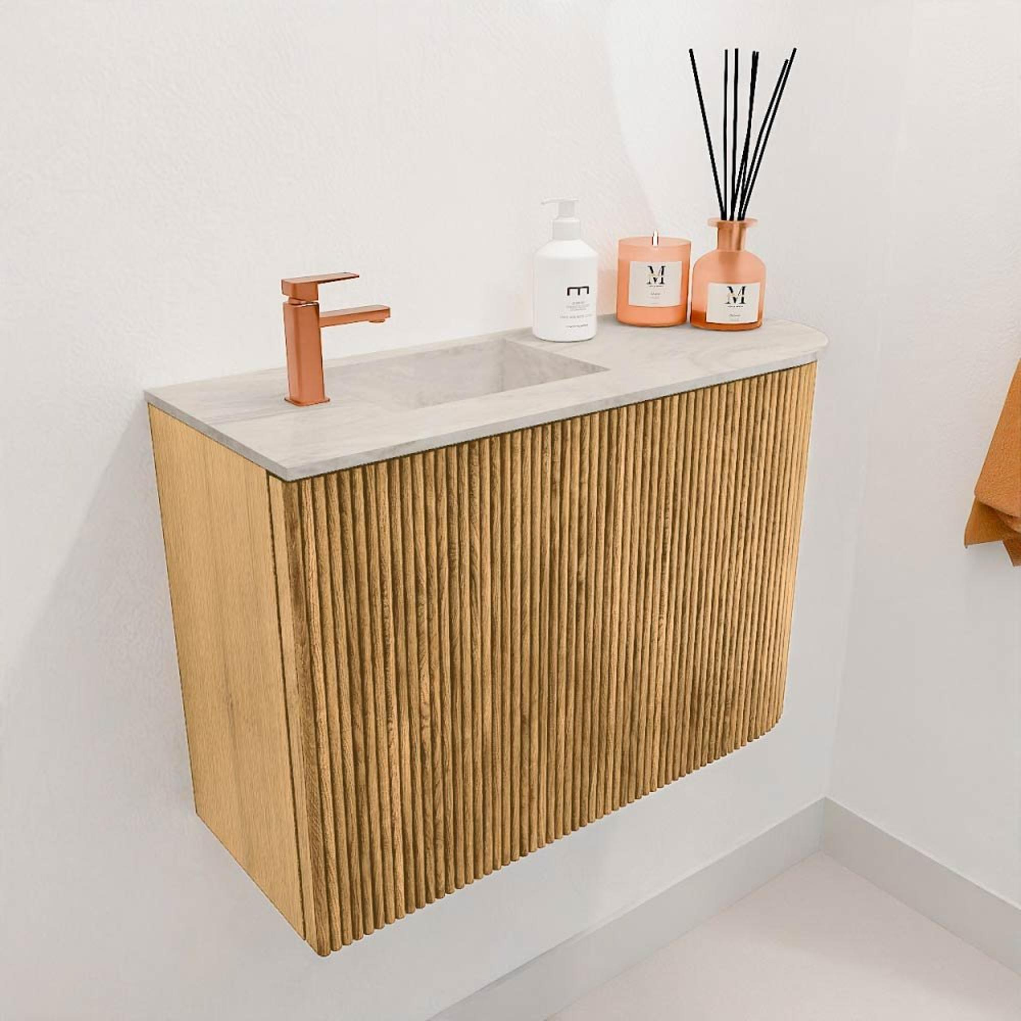 - Wastafel Faye met links geplaatst kraangat in Ostra-kleur – praktisch en elegant