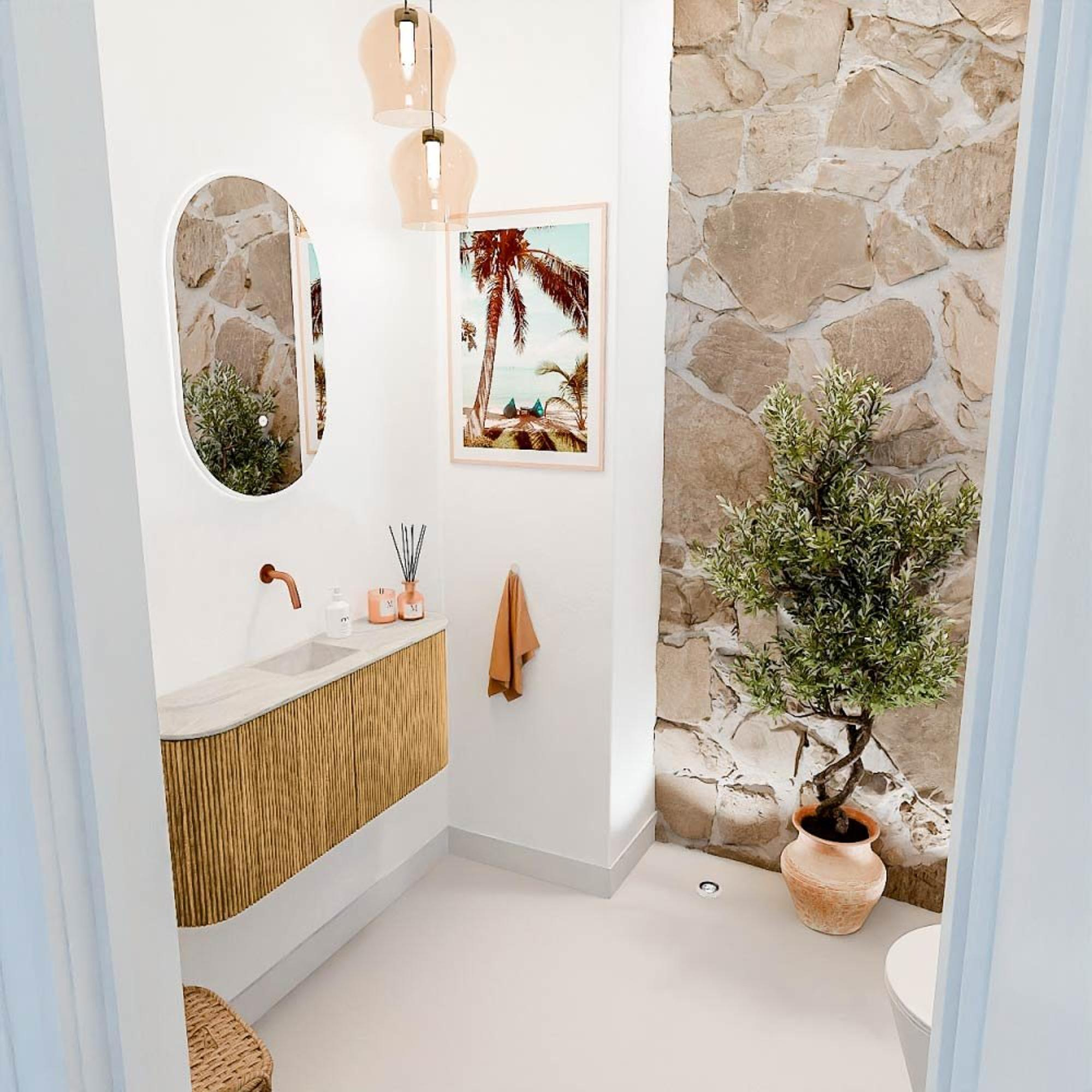 Met dit prachtige meubel geef je jouw badkamer direct een warme en natuurlijke uitstraling. Het combineert de tijdloze charme van massief eikenhout met een modern, functioneel ontwerp dat perfect past in elke badkamerstijl. Dankzij de subtiele rondingen aan beide zijden voelt het meubel niet alleen uitnodigend aan, maar zorgt het ook voor een zachte, elegante uitstraling die je badkamer een unieke sfeer geeft. De centrale wastafel in een zachte ostra-kleur maakt het geheel compleet en biedt een frisse, lichte touch die moeiteloos aansluit bij diverse badkamerinrichtingen. Dit meubel is niet alleen mooi om te zien, maar ook uiterst praktisch dankzij de slimme indeling en hoogwaardige materialen die jarenlang meegaan. Zo geniet je elke dag van een badkamer die zowel stijlvol als functioneel is, waar je met plezier je ochtendroutine start en ontspant na een lange dag.