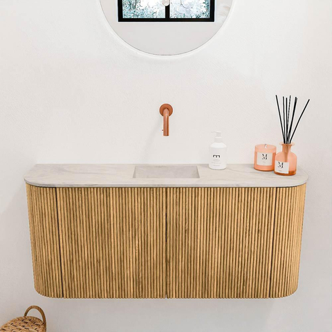 De combinatie van massief eikenhout en een warme oak-kleur zorgt voor een natuurlijke en luxe uitstraling. De ronde vormen aan de linker- en rechterkant geven het meubel een zachte, moderne touch die je badkamer direct een stijlvolle upgrade geeft. Dit meubel is een echte blikvanger die moeiteloos past bij zowel klassieke als eigentijdse badkamers. Door de subtiele details en hoogwaardige afwerking straalt het meubel kwaliteit en vakmanschap uit, waardoor je badkamer een warme en uitnodigende sfeer krijgt.