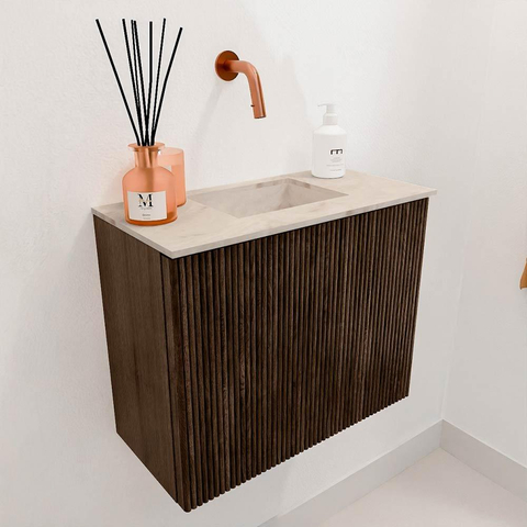 Dit meubel valt direct op door het elegante design met verticale ribbels die subtiel diepte en karakter toevoegen. De walnootkleur geeft een warme, natuurlijke sfeer die perfect aansluit bij diverse interieurstijlen, van modern tot klassiek. Dankzij de hoogwaardige afwerking en het gebruik van massief eiken straalt het meubel kwaliteit en vakmanschap uit. Zo haal je niet zomaar een badkamermeubel in huis, maar een stijlvol pronkstuk dat jouw ruimte verrijkt en uitnodigt tot ontspanning.