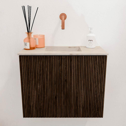 Ondanks het compacte formaat biedt dit meubel verrassend veel opbergruimte om al je badkamerbenodigdheden netjes en uit het zicht te bewaren. De wastafel zonder kraangat geeft je de vrijheid om zelf een kraan te kiezen die perfect aansluit bij jouw wensen en stijl. Dankzij de centrale positie van de wastafel is het meubel bovendien praktisch in gebruik en gemakkelijk schoon te houden. Zo combineer je moeiteloos functionaliteit met een warme uitstraling, waardoor jouw badkamer niet alleen mooi maar ook heel praktisch wordt.