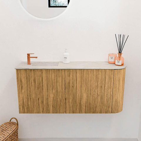 De warme Oak-kleur van het meubel geeft je badkamer een natuurlijke en uitnodigende sfeer. De subtiele ronding aan de rechterkant maakt het ontwerp uniek en elegant, waardoor het meubel een echte blikvanger wordt. De wastafel in Ostra-kleur voegt een frisse, lichte touch toe die mooi contrasteert met het hout. Zo creëer je een harmonieuze balans tussen modern en natuurlijk, passend bij uiteenlopende interieurstijlen. Dit meubel tilt de uitstraling van jouw badkamer naar een hoger niveau.