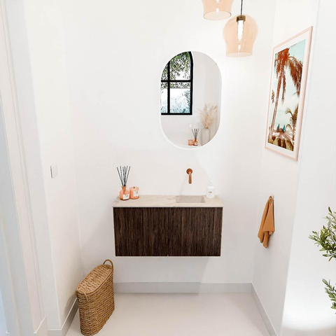 Het meubel valt direct op door zijn warme walnootkleur en de verticale ribbelstructuur die het front een unieke textuur geeft. Deze combinatie zorgt voor een tijdloze uitstraling die moeiteloos aansluit bij verschillende interieurstijlen, van modern tot klassiek. De afwerking zonder afgeronde hoeken benadrukt het strakke design en geeft je badkamer een eigentijdse, verzorgde look. Zo voeg je een subtiel maar krachtig statement toe aan je ruimte, zonder dat het overheerst.