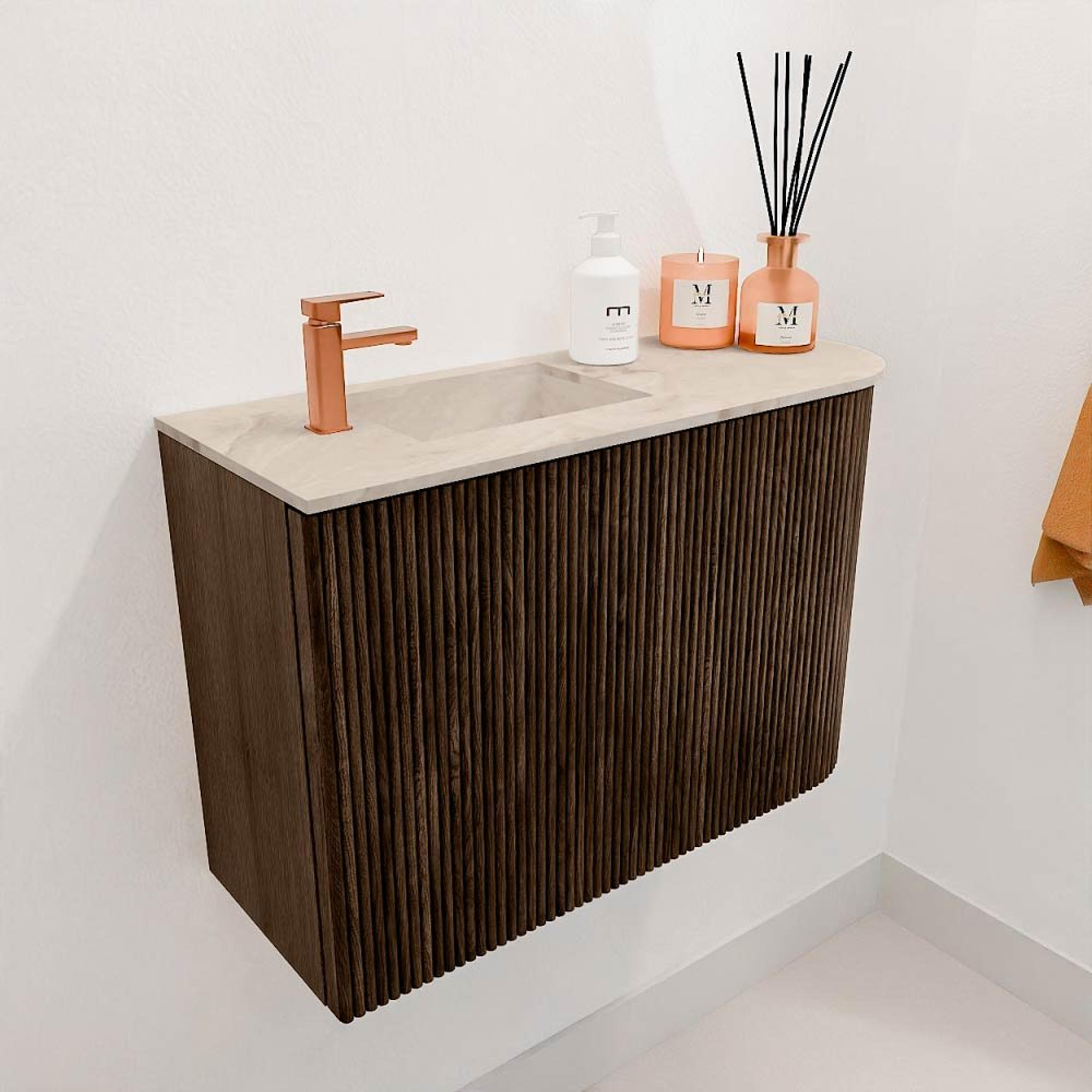 Mondiaz JOYA-DLUX 61.6cm toiletmeubel - ronding rechts kleur Walnut - Wastafel FAYE positie Links 1 kraangat kleur Frappe.