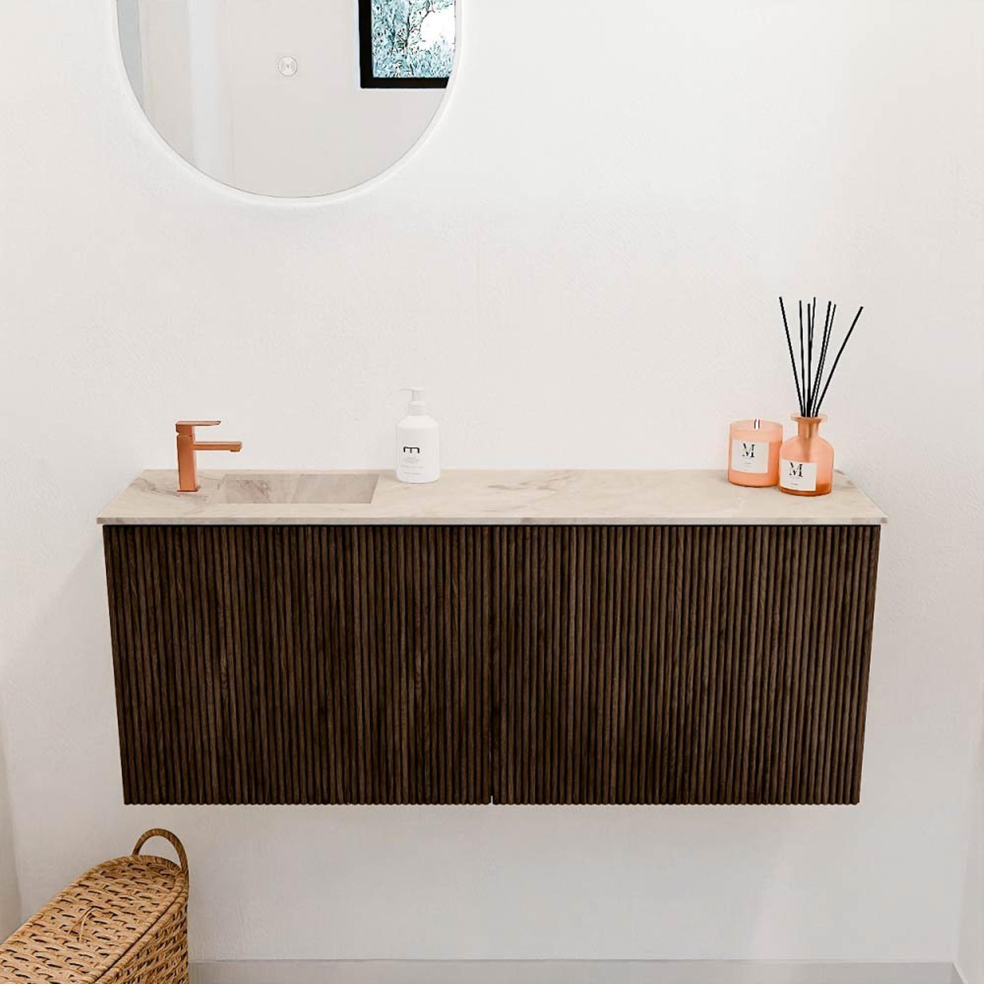 - Wastafel Faye, links geplaatst, in de kleur Frappe met één kraangat