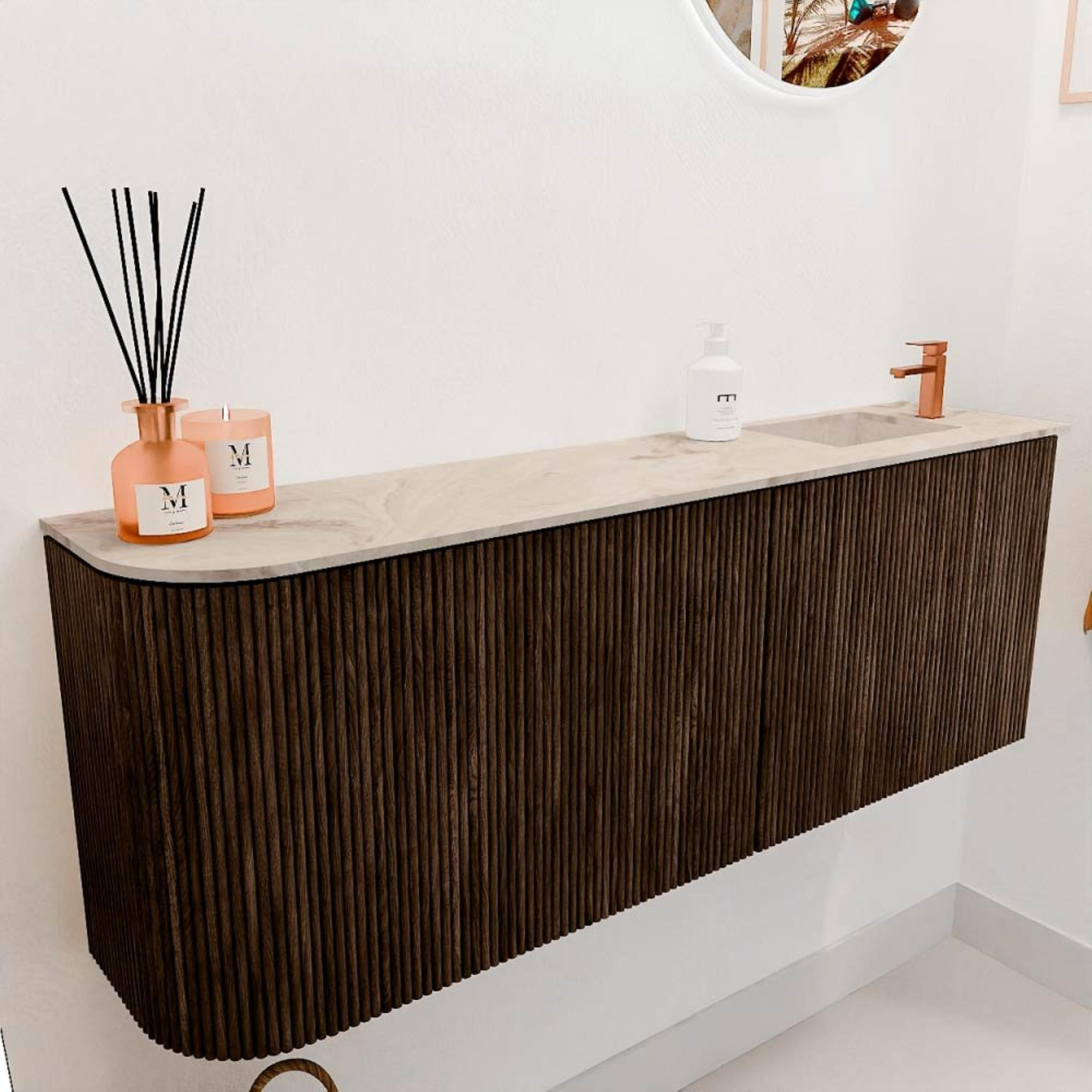 Met zijn warme walnootafwerking en de zachte ronding aan de linkerkant is dit meubel een echte blikvanger. De natuurlijke houtstructuur geeft een luxe en authentieke sfeer, die moeiteloos aansluit bij diverse interieurstijlen. Of je nu kiest voor een moderne, landelijke of klassieke badkamer, dit meubel voegt altijd een stijlvolle touch toe. De frappé wastafel met een kraangat rechts zorgt voor een subtiel contrast en maakt het geheel compleet. Zo creëer je een badkamer die niet alleen functioneel is, maar ook uitnodigt om te ontspannen en te genieten.