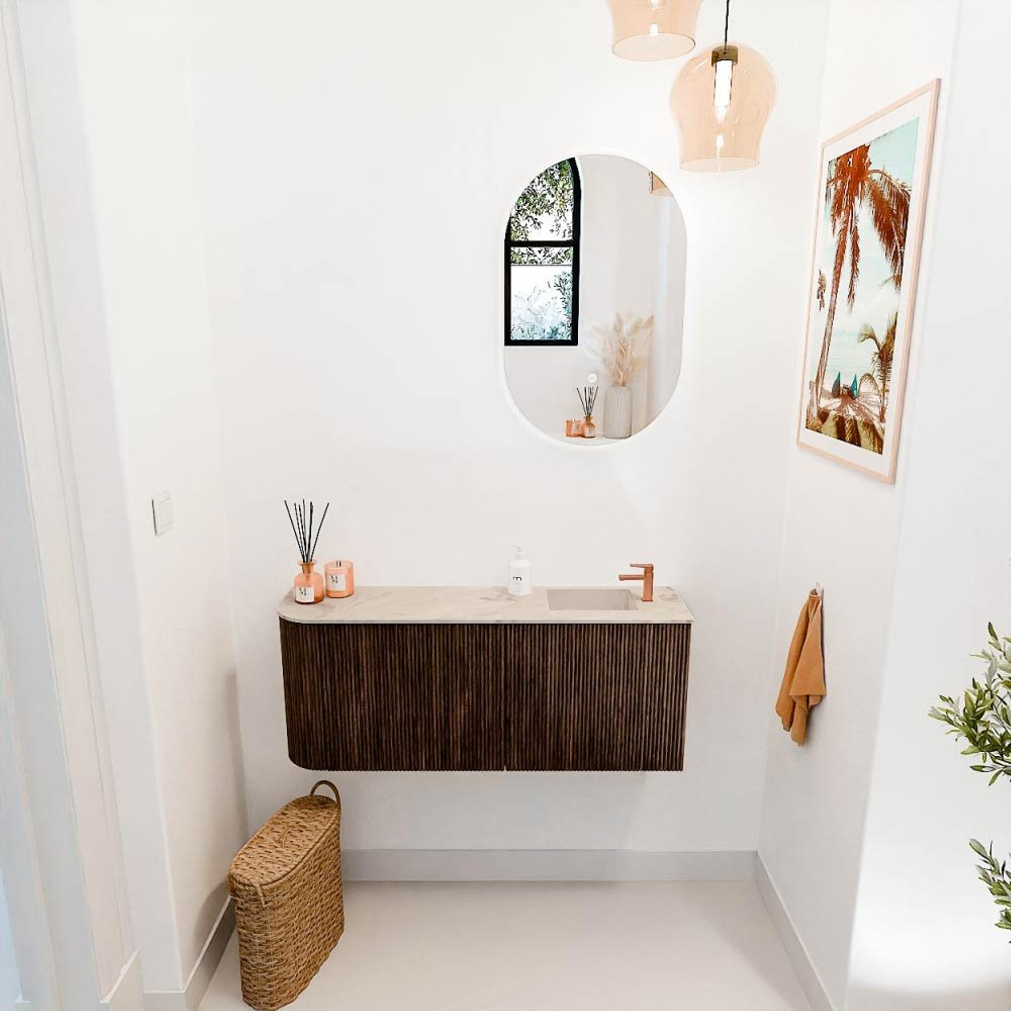 Met dit prachtige meubel geef je jouw badkamer direct een warme en natuurlijke uitstraling. Het combineert een tijdloos design met slimme functionaliteit, waardoor het niet alleen mooi oogt, maar ook perfect aansluit bij jouw dagelijkse routine. De subtiele ronding aan de linkerkant zorgt voor een speels en uniek accent, terwijl de warme walnootkleur het geheel een luxe en uitnodigende sfeer geeft. Dankzij de royale afmetingen van ruim 100 cm breed en de praktische indeling, biedt dit meubel voldoende opbergruimte om jouw badkamer netjes en overzichtelijk te houden. De bijpassende wastafel in een zachte frappe kleur met een handige kraangat rechts maakt het plaatje compleet. Zo geniet je elke dag van een stijlvolle en functionele badkamer waar je met plezier tijd doorbrengt.