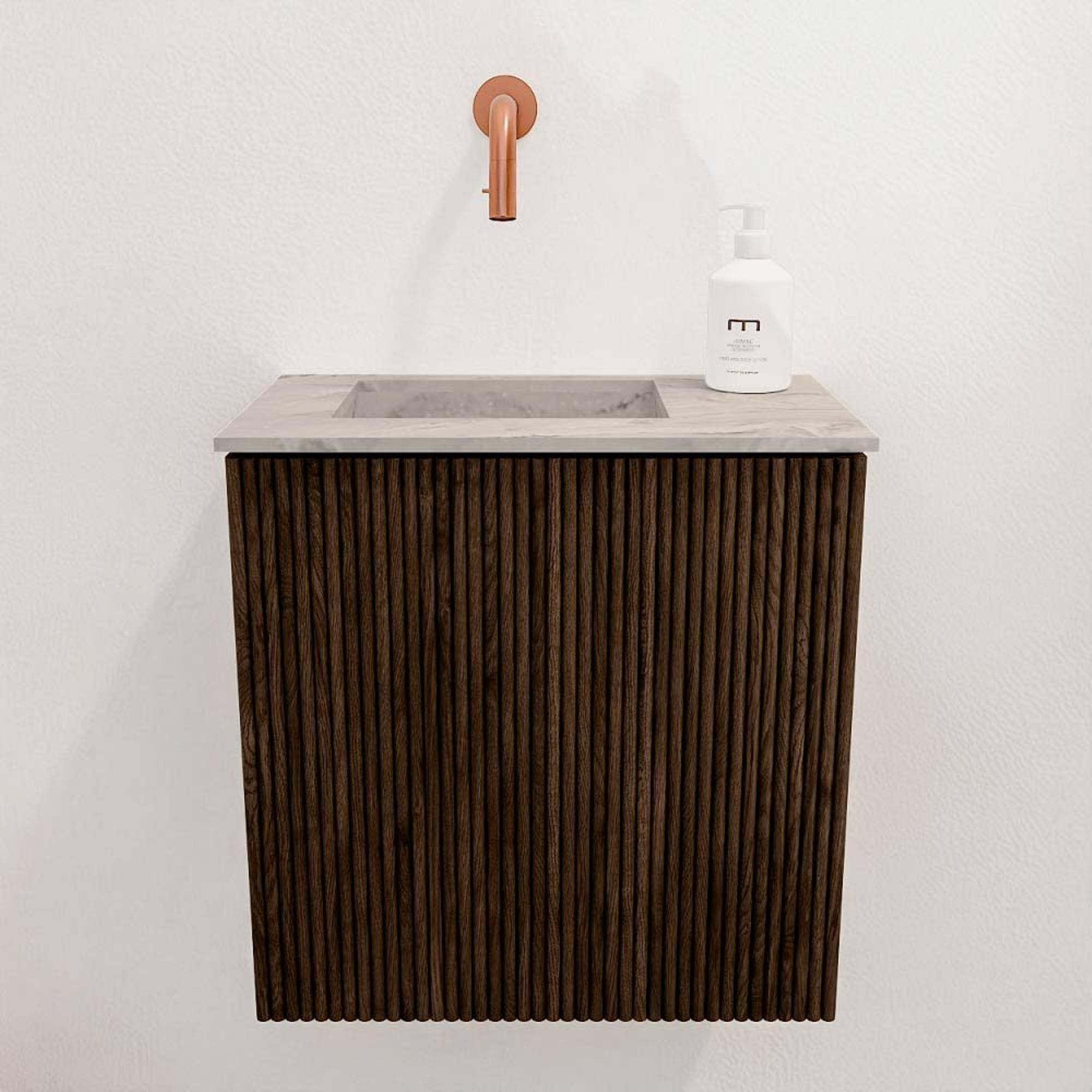 Met dit compacte meubel geef je jouw gastentoilet of kleine badkamer direct een stijlvolle en praktische upgrade. Het combineert warme, natuurlijke walnootkleuren met een strak design dat dankzij de verticale groeven een moderne uitstraling krijgt. De wastafel is subtiel aan de linkerkant geplaatst, wat zorgt voor een slimme indeling zonder in te leveren op comfort. Dankzij het ontbreken van een kraangat kun je zelf kiezen voor een kraan die perfect bij jouw stijl en wensen past. Dit meubel is niet alleen een lust voor het oog, maar ook een slimme oplossing voor wie ruimte wil besparen zonder in te leveren op kwaliteit en gebruiksgemak. De combinatie van massief eiken en eikenfineer geeft het meubel een robuuste uitstraling en zorgt voor een lange levensduur. Zo maak je van jouw kleine ruimte een plek die uitnodigt en indruk maakt, elke dag opnieuw.