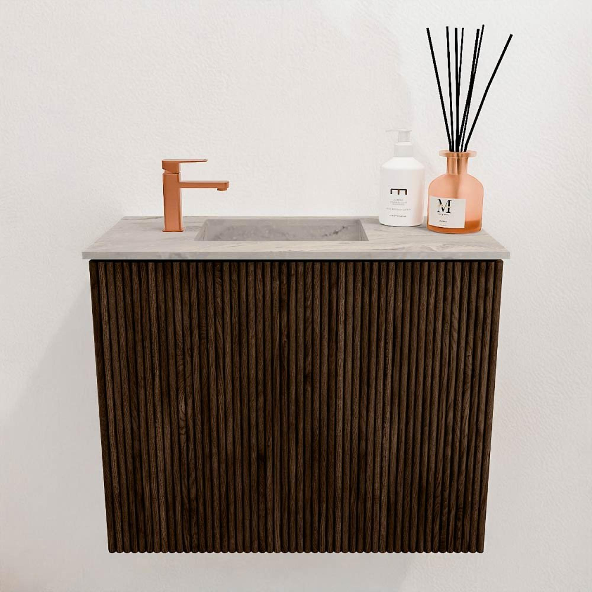 Met een breedte van 50 cm is dit meubel ideaal voor kleinere toiletruimtes waar elke centimeter telt. De wastafel is slim aan de linkerkant geplaatst, waardoor je meer gebruiksvriendelijke ruimte hebt om je handen te wassen zonder dat het meubel in de weg staat. Het enkele kraangat maakt het mogelijk om een kraan naar keuze te installeren die past bij jouw stijl en wensen. Bovendien is het meubel ontworpen voor wandmontage, wat zorgt voor een opgeruimde uitstraling en het schoonmaken van de vloer vergemakkelijkt.