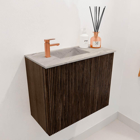 Mondiaz JOYA-DLUX 50cm toiletmeubel - kleur Walnut - Wastafel FAYE positie Links 1 kraangat kleur Glace.
