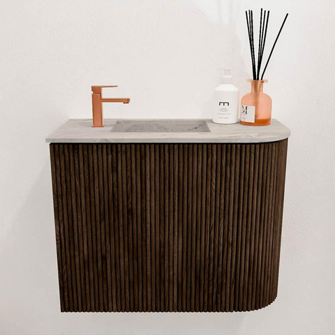 Mondiaz JOYA-DLUX 51.6cm toiletmeubel - ronding rechts kleur Walnut - Wastafel FAYE positie Links 1 kraangat kleur Glace.