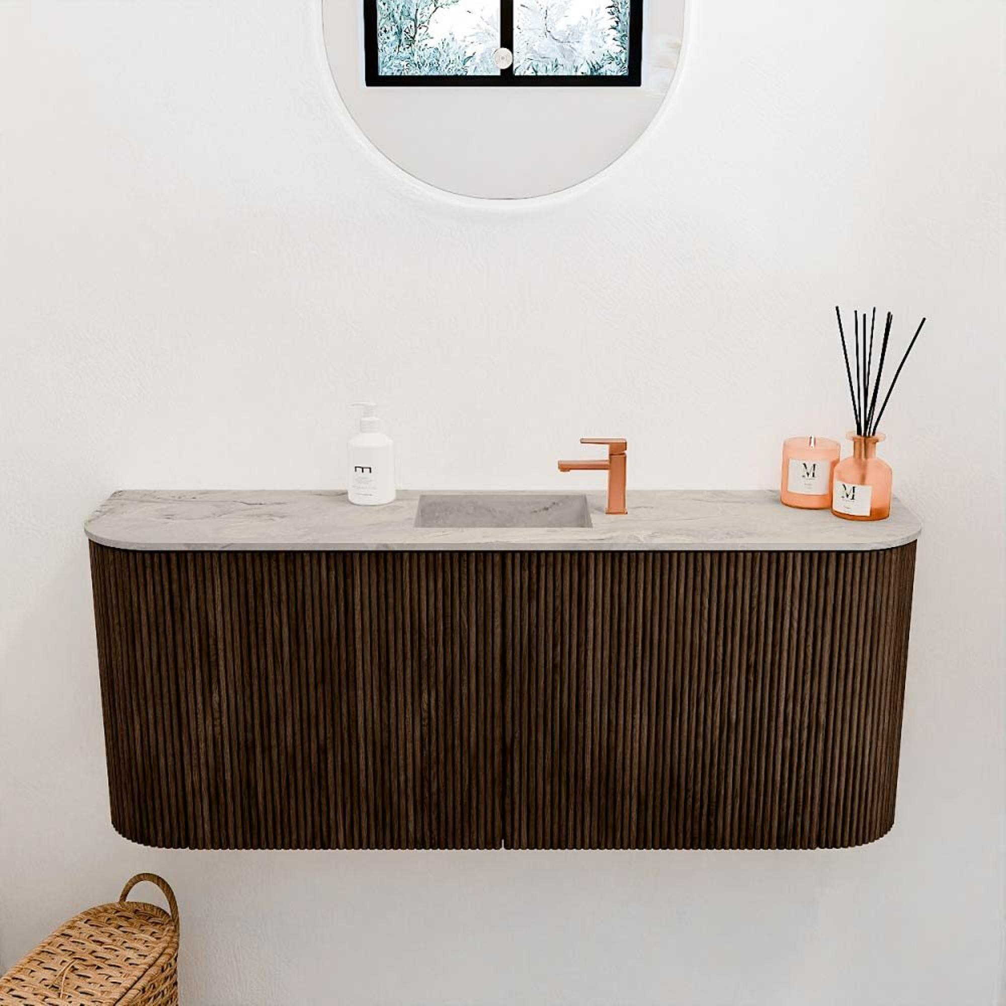 De combinatie van massief eikenhout en eikenfineer in een warme walnootkleur maakt dit meubel tot een echte blikvanger. De afgeronde hoeken aan beide zijden zorgen voor een zachte, uitnodigende uitstraling die perfect past in zowel moderne als klassieke badkamers. Door het gebruik van natuurlijke materialen straalt het meubel kwaliteit en duurzaamheid uit. Zo geef je jouw badkamer niet alleen een luxe uitstraling, maar ook een tijdloze sfeer die jarenlang meegaat.