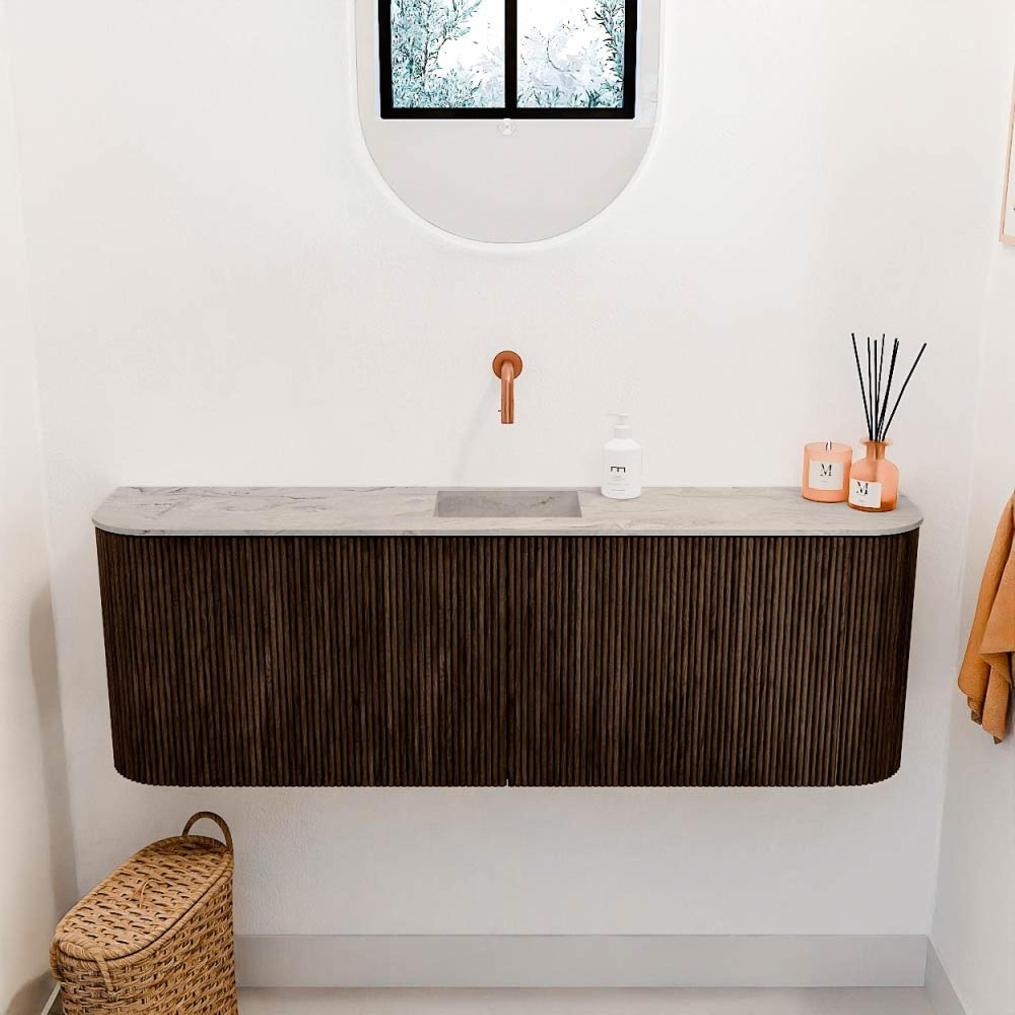 De warme walnootkleur en de elegante rondingen aan beide kanten maken dit meubel tot een echte blikvanger in je badkamer. Het design is modern met een natuurlijke touch, waardoor het naadloos aansluit bij uiteenlopende interieurstijlen. Of je nu houdt van een strakke, minimalistische badkamer of juist een warme, landelijke sfeer wilt creëren, dit meubel past perfect. De combinatie van massief eikenhout aan de voorkant en eikenfineer aan de zijkanten zorgt voor een hoogwaardige uitstraling die je badkamer direct een upgrade geeft. Zo geniet je elke dag van een stijlvolle en uitnodigende ruimte.