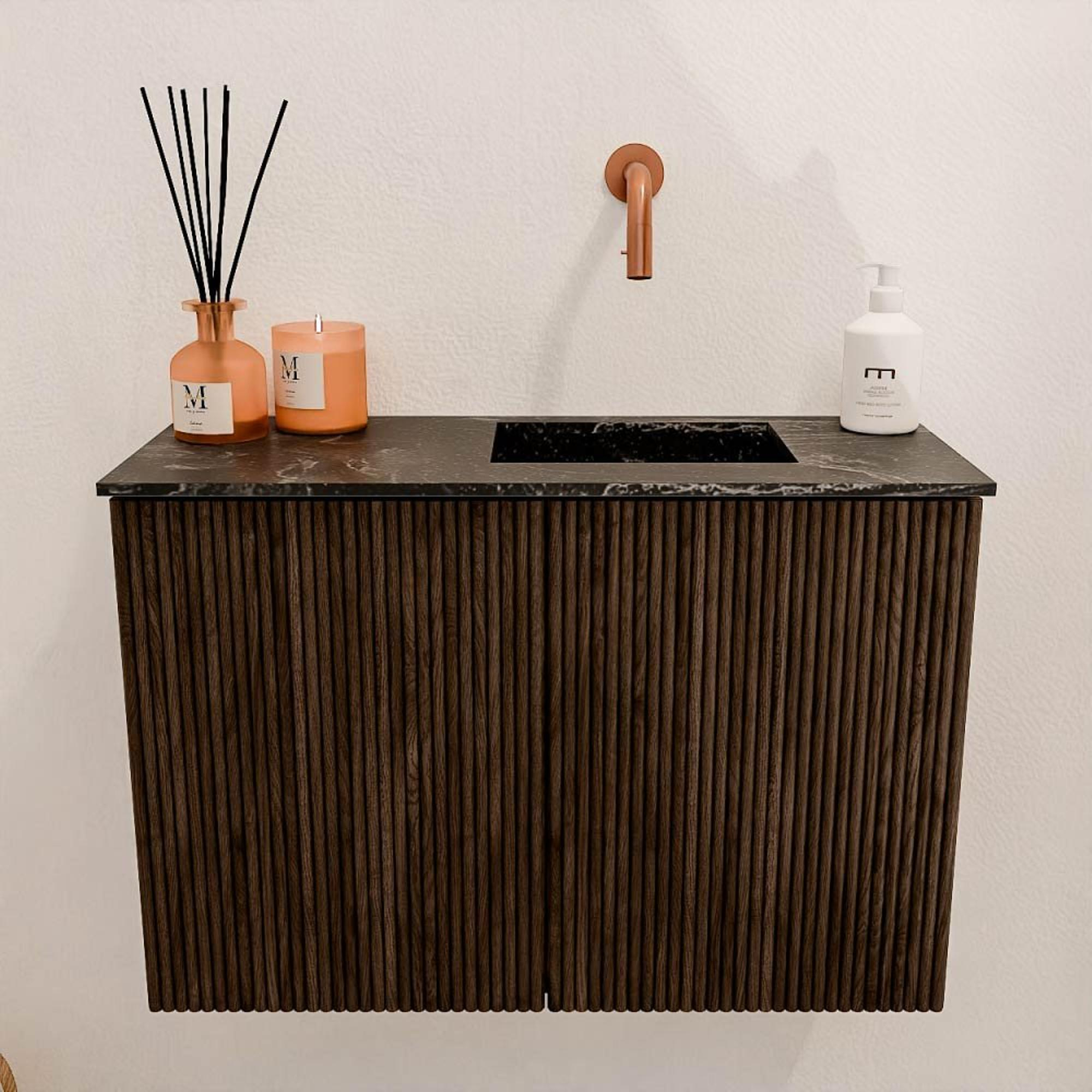 Het meubel valt direct op door het warme walnootfineer en de verticale groeven die het front een moderne en verfijnde uitstraling geven. Deze combinatie van natuurlijke materialen en strakke lijnen zorgt voor een tijdloos design dat moeiteloos aansluit bij verschillende interieurstijlen. Of je nu houdt van een landelijke, moderne of industriële look, dit meubel past er altijd bij. De Lava-kleurige wastafel voegt een subtiel accent toe zonder te overheersen, waardoor het geheel in balans blijft. Zo creëer je een badkamer die niet alleen functioneel is, maar ook uitnodigend en stijlvol aanvoelt.