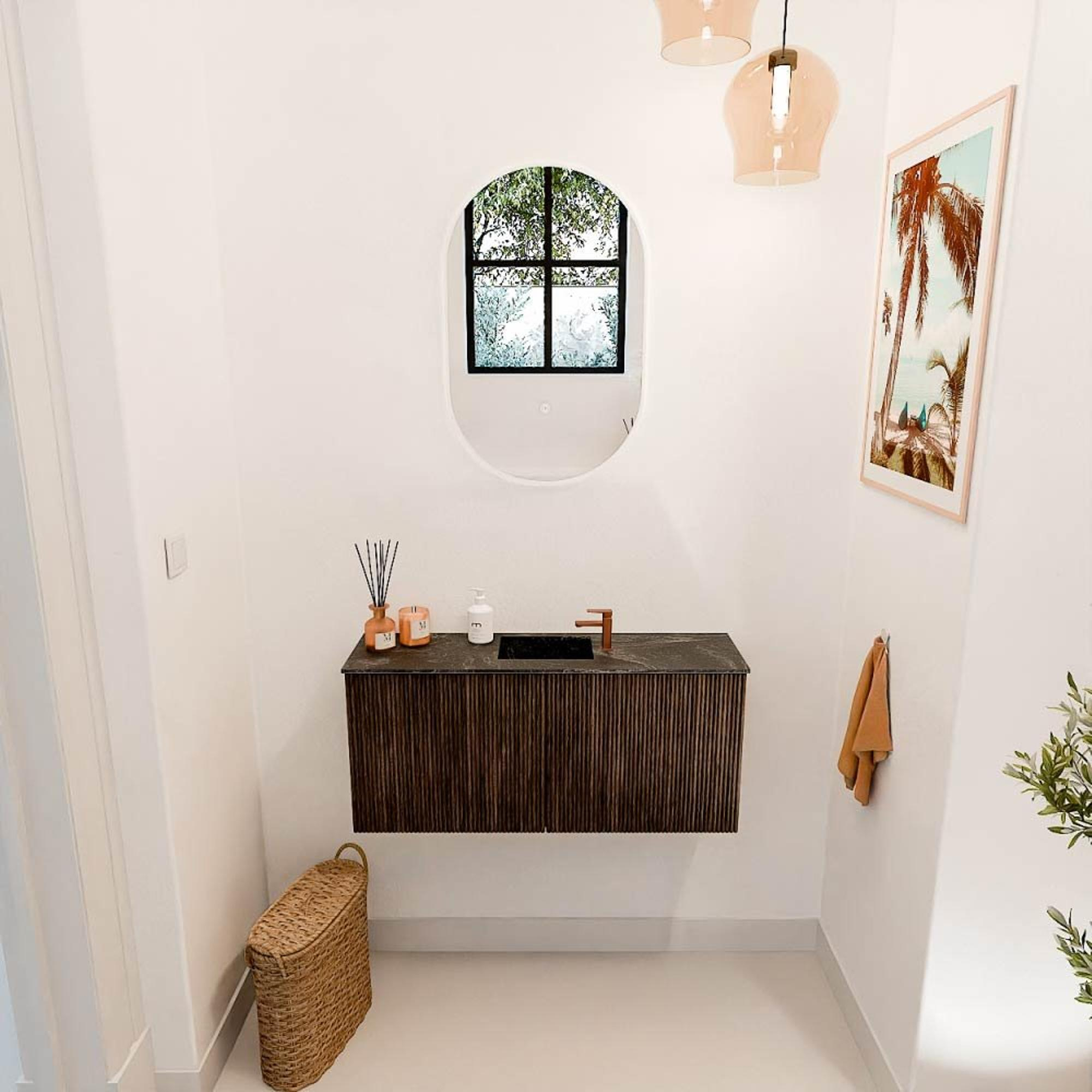 De warme walnootafwerking geeft het meubel een natuurlijke en luxe uitstraling die direct opvalt. Dit meubel is niet zomaar functioneel, het is een echte blikvanger in je badkamer. De combinatie van de donkere houttinten met de lava-kleurige wastafel zorgt voor een harmonieus contrast dat rust en elegantie uitstraalt. Hierdoor creëer je een badkamer die uitnodigt tot ontspanning en waar je trots op kunt zijn. Het design is tijdloos, waardoor je jarenlang geniet van een stijlvolle toevoeging zonder dat het snel verveelt.