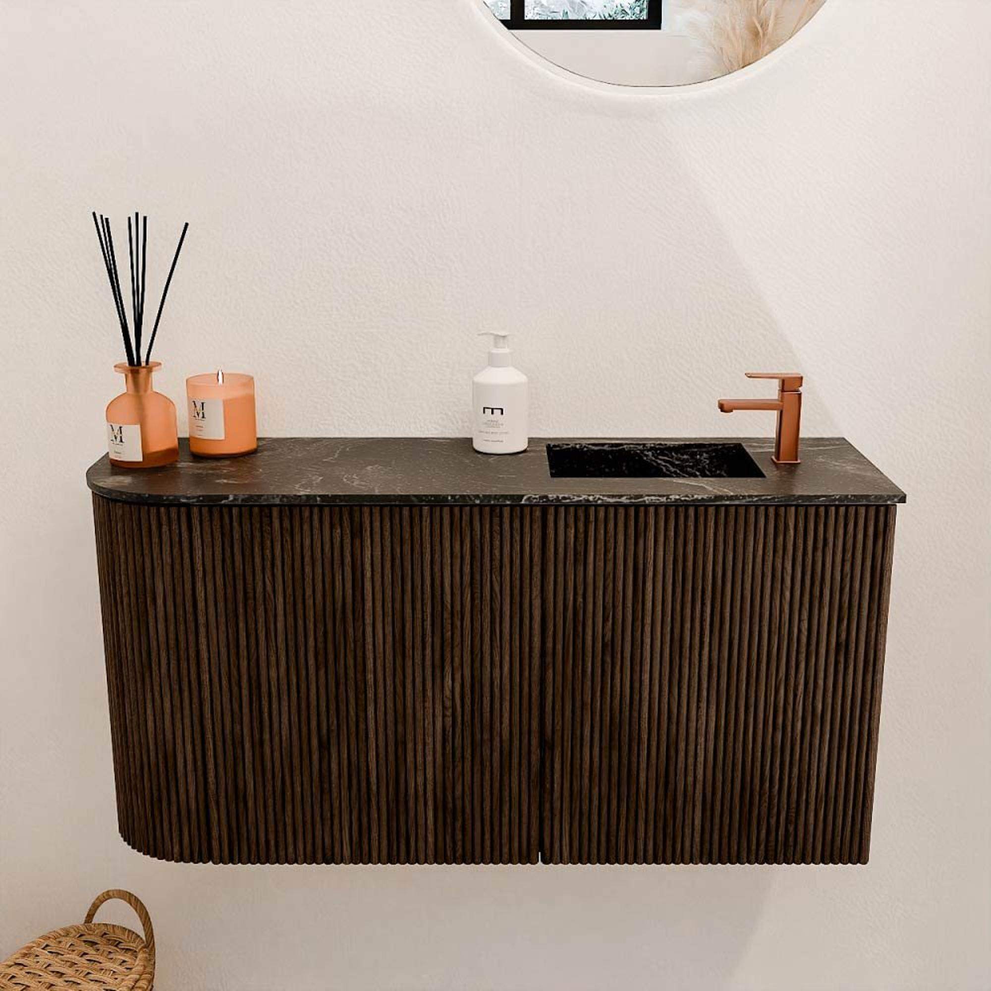 Dit meubel is een toonbeeld van verfijnde stijl. De warme walnootkleur en de natuurlijke houtstructuur geven jouw badkamer een luxe uitstraling die tegelijkertijd uitnodigend en modern is. De afgeronde linkerzijde zorgt voor een zachte, organische vorm die het meubel uniek maakt en het geheel een speels maar toch rustig karakter geeft. Door de combinatie van materialen en kleuren past het meubel moeiteloos bij diverse interieurstijlen, van klassiek tot eigentijds. Zo creëer je een badkamer die niet alleen functioneel is, maar ook een echte blikvanger.