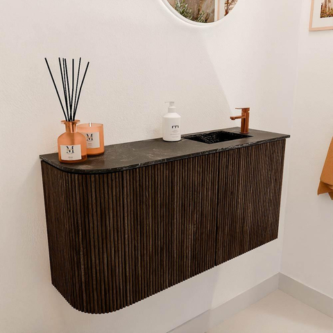 Met dit prachtige meubel geef je jouw badkamer direct een warme en natuurlijke uitstraling. De combinatie van het hoogwaardige walnootfineer en het subtiele design zorgt voor een tijdloze sfeer waarin je elke dag met plezier begint. Dankzij de slimme ronding aan de linkerkant en de compacte afmetingen past dit meubel perfect in kleinere ruimtes zonder dat je inlevert op stijl of functionaliteit. De wastafel in lava kleur met een kraangat aan de rechterzijde voegt een stoer accent toe, terwijl het praktische ontwerp je badkamer netjes en overzichtelijk houdt. Dit meubel is niet alleen een lust voor het oog, maar ook een betrouwbare partner in je dagelijkse routine, die comfort en elegantie moeiteloos samenbrengt.