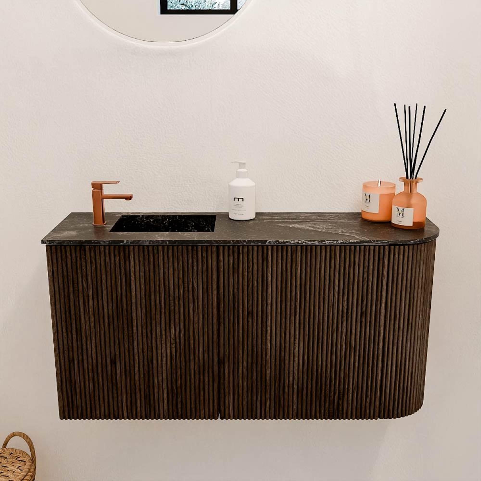 De walnootkleurige afwerking in combinatie met de verticale ribbelstructuur op de deuren geeft dit meubel een verfijnde en natuurlijke uitstraling. Het design is modern en toch tijdloos, waardoor het moeiteloos past in verschillende badkamerstijlen, van klassiek tot eigentijds. Door de subtiele ronding aan de rechterkant krijgt het meubel een uniek karakter dat direct opvalt. Dit stijlvolle meubel zorgt ervoor dat jouw badkamer er verzorgd en uitnodigend uitziet, wat bijdraagt aan een prettige sfeer waarin je je elke dag weer thuis voelt.