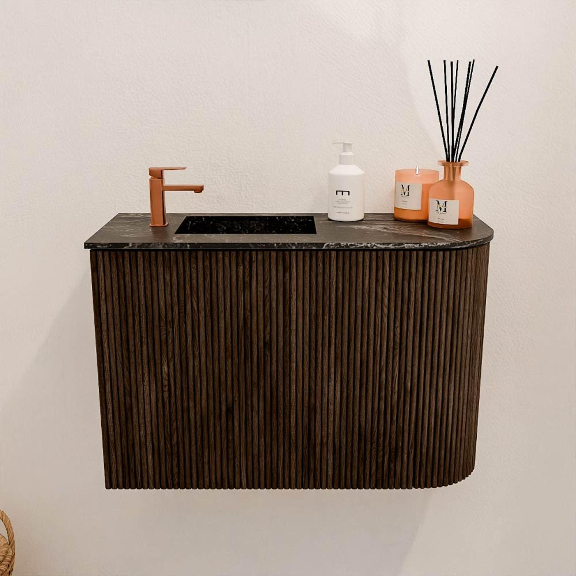 Met dit prachtige meubel geef je jouw badkamer direct een warme en natuurlijke uitstraling. Het compacte formaat maakt het ideaal voor kleinere ruimtes, zonder in te leveren op stijl of functionaliteit. Dankzij de hoogwaardige afwerking in walnootkleur en de subtiele ronding aan de rechterzijde, wordt het een echte blikvanger in jouw badkamer. De geïntegreerde wastafel met een kraangat aan de linkerkant zorgt voor een praktische indeling, waardoor je moeiteloos je dagelijkse routine kunt uitvoeren. Dit meubel combineert vakmanschap met een modern design, waardoor jouw badkamer niet alleen mooi oogt, maar ook prettig en efficiënt in gebruik is. Zo geniet je elke dag van een opgeruimde en sfeervolle ruimte waar je je helemaal thuis voelt.