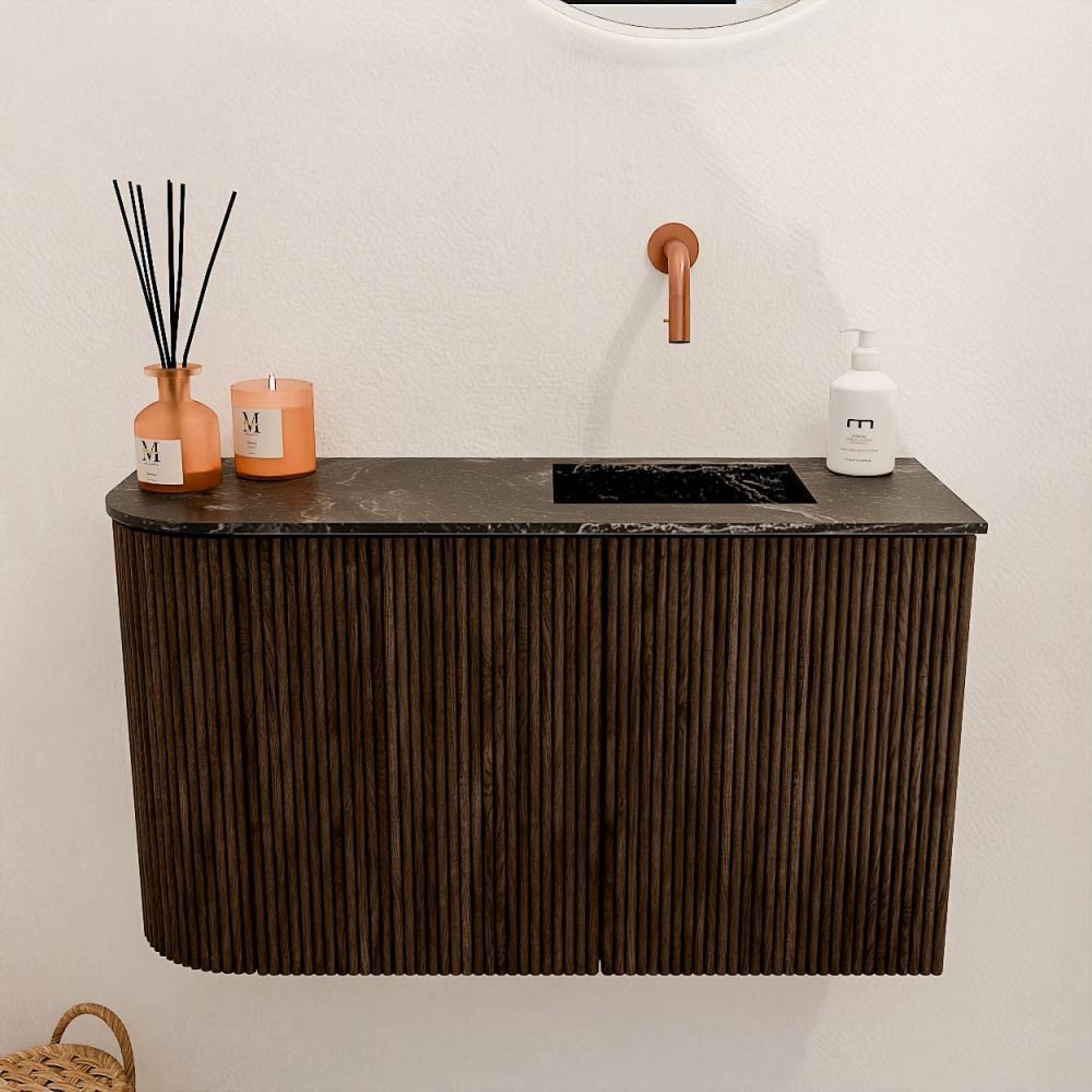De warme walnootkleur en het natuurlijke eikenhout geven het meubel een tijdloze en elegante uitstraling. Dit maakt het een echte blikvanger in je badkamer, die moeiteloos aansluit bij verschillende interieurstijlen. De subtiele ronding aan de linkerkant voegt een speels detail toe zonder afbreuk te doen aan het strakke design. De lava-kleurige wastafel zorgt voor een stoere en moderne touch, waardoor het geheel een unieke uitstraling krijgt. Zo creëer je een badkamer die niet alleen functioneel is, maar ook inspireert en uitnodigt.