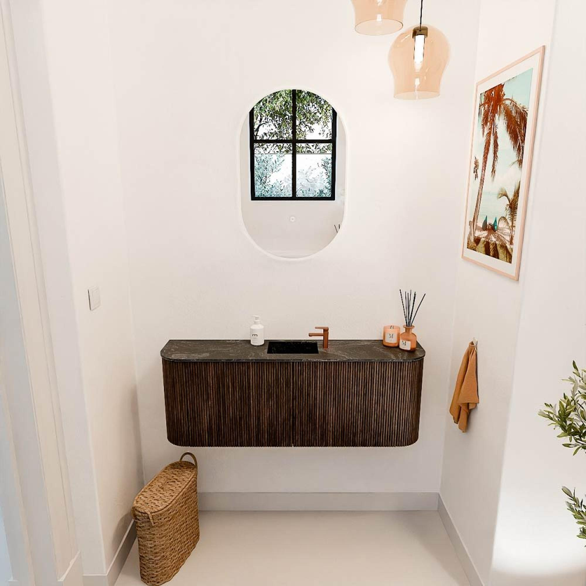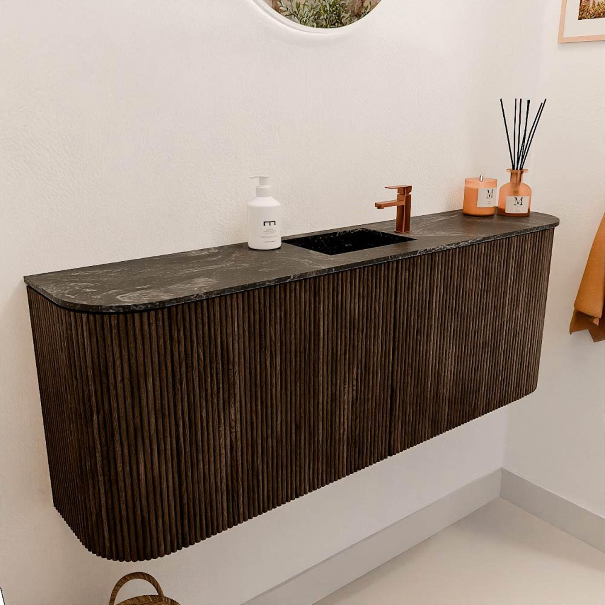 De verticale ribbels in het hout geven het meubel een verfijnde textuur die het direct onderscheidt van standaard badkamermeubels. De walnootkleur zorgt voor een warme, natuurlijke uitstraling die moeiteloos te combineren is met diverse interieurstijlen. Door de afgeronde hoeken aan beide zijden oogt het meubel vriendelijk en uitnodigend. Dit stijlvolle ontwerp maakt jouw badkamer niet alleen mooier, maar verhoogt ook de beleving van luxe en comfort. Zo geniet je elke dag van een badkamer die aanvoelt als een persoonlijke wellnessruimte.