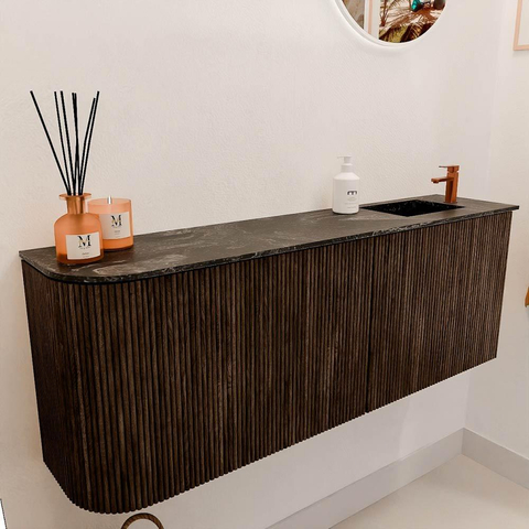 De warme walnootkleur en de subtiele ronding aan de linkerkant geven dit meubel een unieke en verfijnde uitstraling. Het design is modern met een natuurlijke touch, waardoor het moeiteloos in verschillende interieurstijlen past. Door de combinatie van massief eikenhout en multiplex met eikenfineer straalt het meubel kwaliteit en vakmanschap uit. Zo voeg je een echte eyecatcher toe aan je badkamer die ook nog eens tijdloos is. De lava-kleurige wastafel voegt een stoer accent toe, wat het geheel een eigentijdse uitstraling geeft.