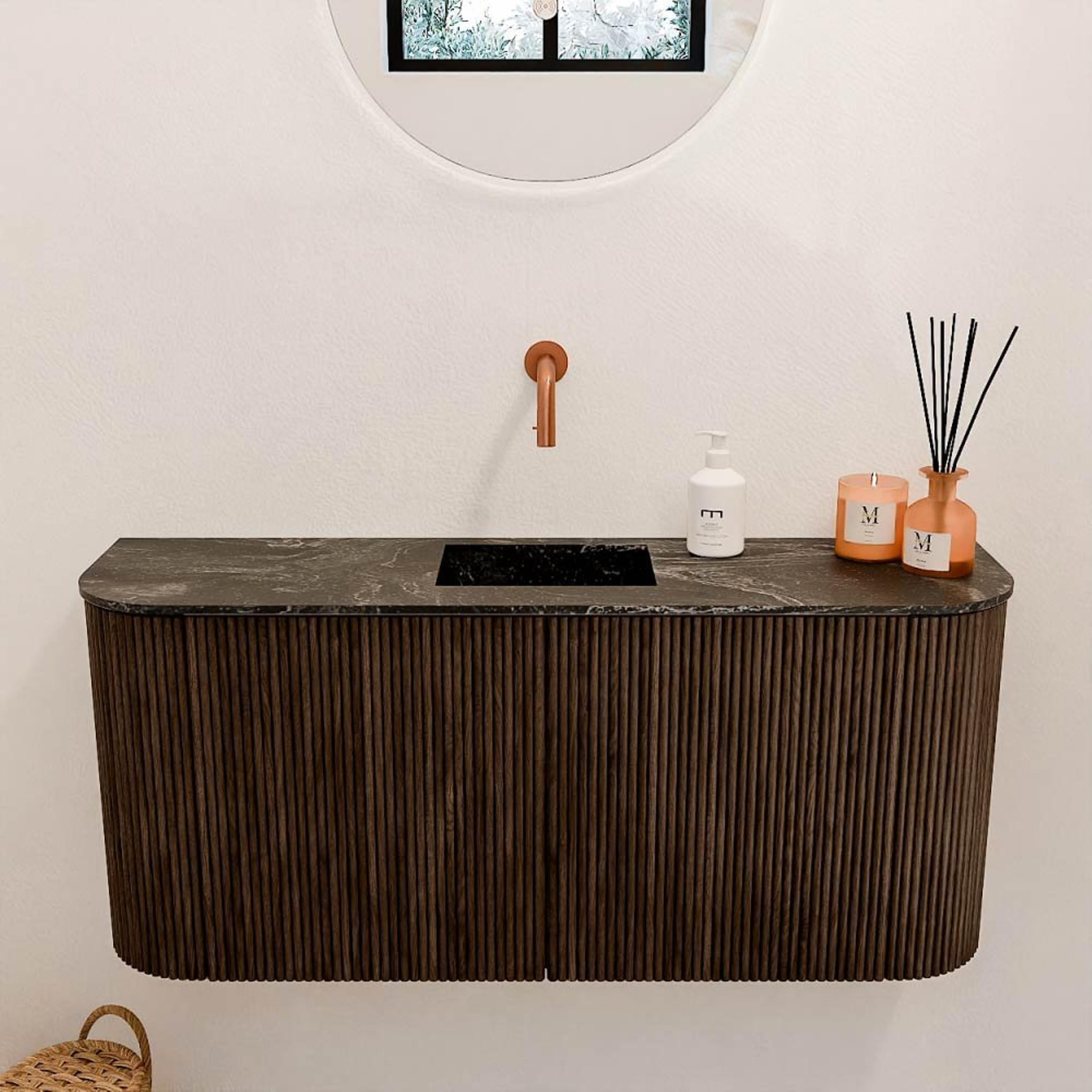 Deze prachtige set brengt een warme en natuurlijke sfeer in jouw badkamer of gastentoilet. Met zijn elegante rondingen aan beide zijden en de rijke walnootkleur straalt het meubel direct klasse uit. De combinatie van massief eikenhout aan de voorkant en eikenfineer aan de zijkanten zorgt voor een duurzame en authentieke uitstraling die je badkamer een tijdloze uitstraling geeft. De wastafel in Lava-kleur, centraal gepositioneerd en zonder kraangat, maakt het geheel compleet en biedt volop ruimte om je dagelijkse routine comfortabel uit te voeren. Dit meubel is niet alleen een lust voor het oog, maar ook verrassend praktisch dankzij de slimme indeling en het wandmontageconcept, waardoor je vloer vrij blijft en je badkamer ruimtelijk oogt. Zo transformeer je jouw ruimte moeiteloos in een stijlvolle en functionele plek waar je elke dag met plezier begint.