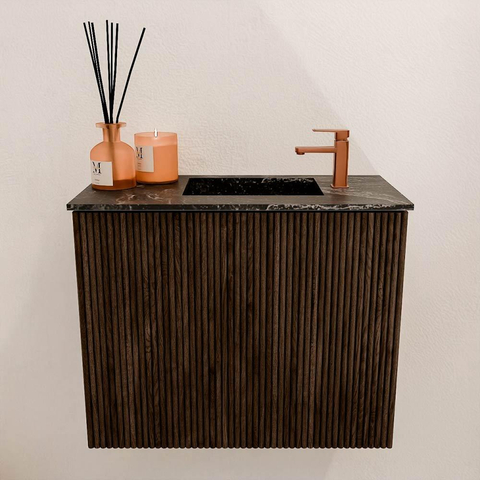Met dit compacte meubel geef je jouw toilet of kleine badkamer direct een stijlvolle en praktische upgrade. De warme walnootkleur en de natuurlijke uitstraling van massief eikenhout zorgen voor een tijdloze sfeer die je ruimte uitnodigend en verzorgd maakt. Dankzij het slimme formaat van 50 cm breed past het meubel perfect in kleinere ruimtes zonder in te leveren op opbergruimte of functionaliteit. De wastafel, uitgevoerd in de diepe lava-kleur, voegt een eigentijdse touch toe en is voorzien van een kraangat aan de rechterkant, wat het aansluiten van je kraan eenvoudig en flexibel maakt. Dit meubel is niet alleen een lust voor het oog, maar ook een betrouwbare partner in je dagelijkse routine. Door de wandmontage oogt het geheel luchtig en makkelijk schoon te houden, waardoor je badkamer er altijd netjes uitziet. Zo transformeer je jouw badkamer of toilet in een plek waar je met plezier tijd doorbrengt.