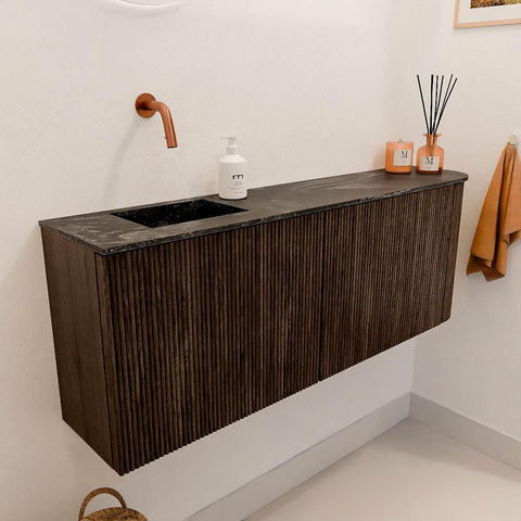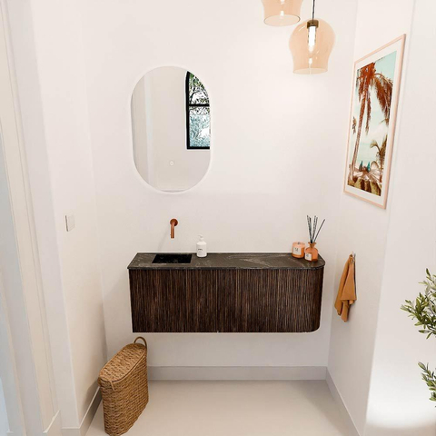- Wastafel in Lava-kleur met kraanpositie links, zonder voorgeboord kraangat – maximale vrijheid in kraankeuze