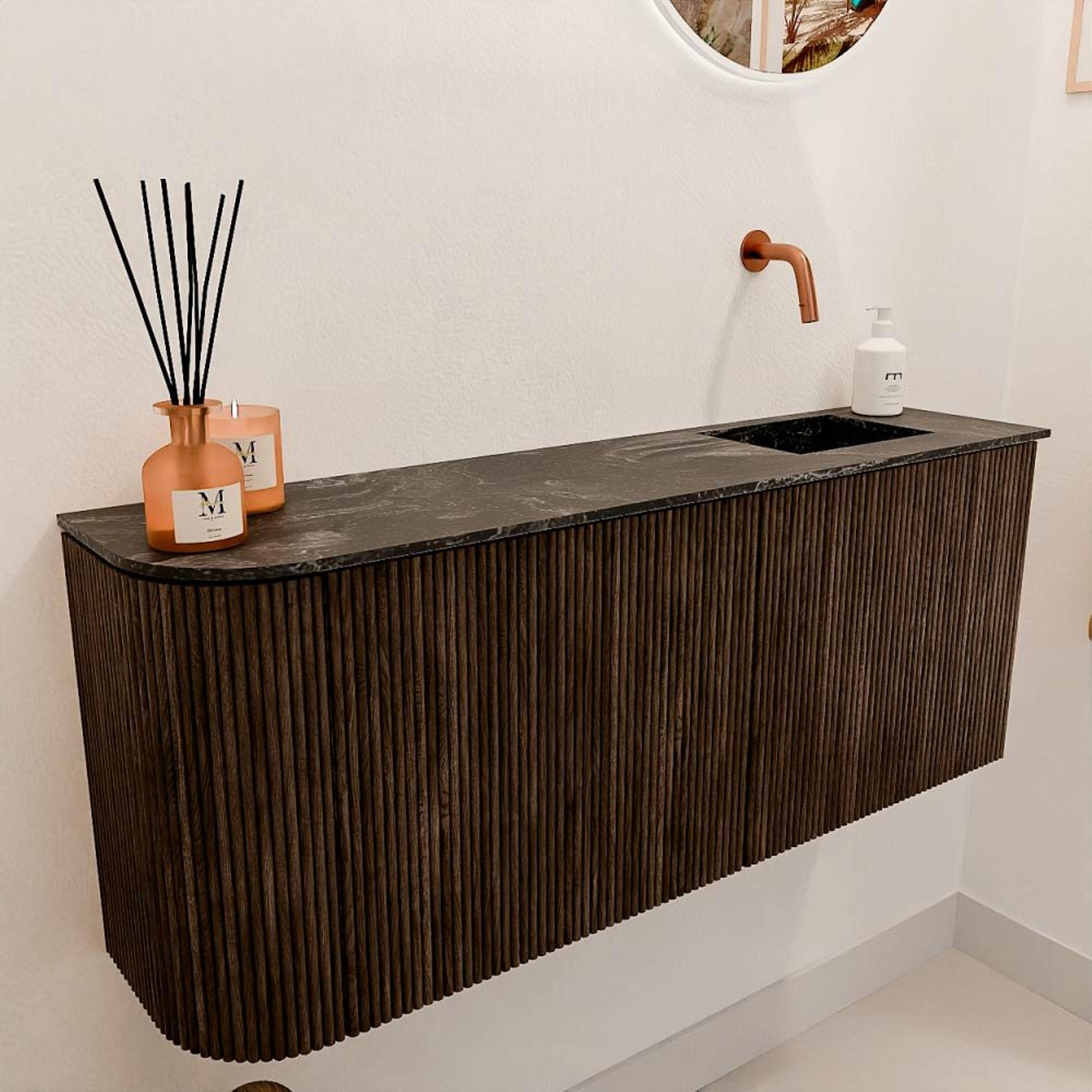 De combinatie van massief eikenhout en walnootfineer zorgt voor een tijdloze en natuurlijke uitstraling die in vrijwel elke badkamer tot zijn recht komt. De verticale groeven in het meubel geven het een verfijnde textuur en een premium look. Door de afgeronde linkerzijde krijgt het meubel een unieke vorm die het onderscheidt van standaard badkamermeubels. Dit maakt het niet alleen een functioneel element, maar ook een echte eyecatcher die jouw badkamer een warme en uitnodigende sfeer geeft.