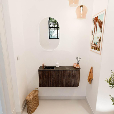 Het meubel valt direct op door zijn elegante walnootafwerking en de subtiele ronding aan de rechterzijde. Deze unieke vormgeving geeft een speels en toch verfijnd karakter aan je badkamer. De verticale groeven in het massief eikenhout zorgen voor een natuurlijke textuur die warmte en sfeer toevoegt. Zo creëer je een tijdloos interieur dat moeiteloos aansluit bij verschillende stijlen, van modern tot klassiek. Door de combinatie van hout en de lava gekleurde wastafel ontstaat een harmonieuze balans tussen natuurlijk en industrieel, wat jouw badkamer nét dat beetje extra geeft.