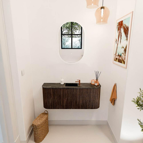 De warme walnootafwerking geeft het meubel een tijdloze en luxe uitstraling die moeiteloos past in diverse badkamerstijlen. De afgeronde hoeken zorgen voor een zachte, organische vorm die het geheel een unieke uitstraling geeft. Dit stijlvolle ontwerp maakt jouw badkamer niet alleen mooier, maar verhoogt ook de beleving van comfort en rust. Door de combinatie van natuurlijke materialen en moderne kleuren ontstaat een harmonieus geheel dat uitnodigt tot ontspanning.