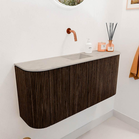 De combinatie van massief eikenhout met een walnootfineer afwerking geeft dit meubel een luxe en natuurlijke uitstraling. De afgeronde hoeken aan beide zijden zorgen voor een zacht en modern design dat direct opvalt. Zo creëer je een badkamer die niet alleen functioneel is, maar ook een echte blikvanger wordt. Door de warme kleur en het verfijnde houtpatroon voelt de ruimte meteen uitnodigend en sfeervol aan. Dit meubel is een perfecte keuze als je op zoek bent naar een stijlvolle oplossing die jarenlang meegaat zonder aan charme in te boeten.