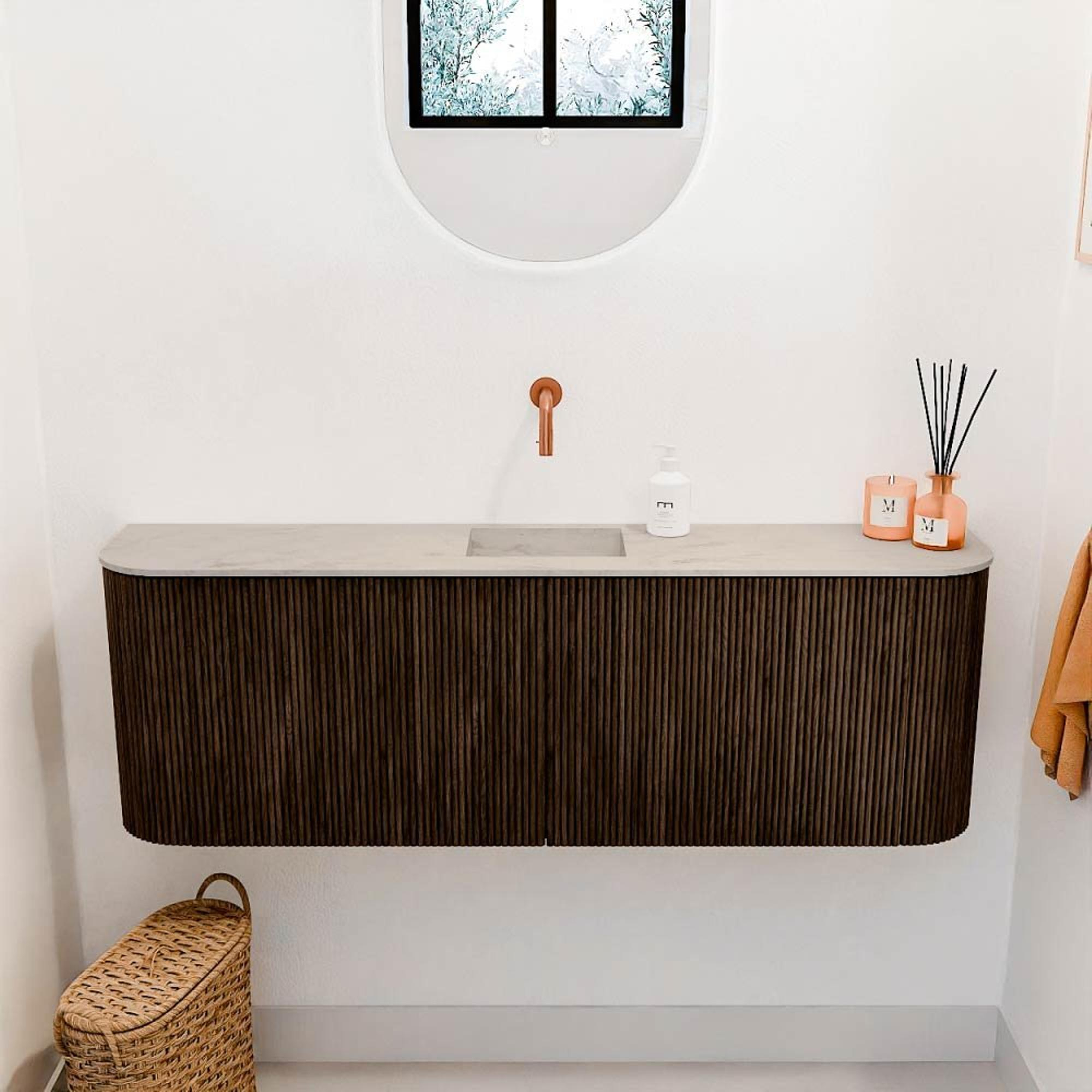 De warme walnootkleur en de elegante rondingen maken dit meubel tot een echte blikvanger. Het gebruik van massief eikenhout aan de voorkant zorgt voor een natuurlijke en authentieke uitstraling die je badkamer direct verrijkt. Door de subtiele details en het strakke design past het meubel moeiteloos in verschillende interieurstijlen, van modern tot klassiek. Zo creëer je een badkamer die niet alleen functioneel is, maar ook een plek waar je graag tijd doorbrengt.
