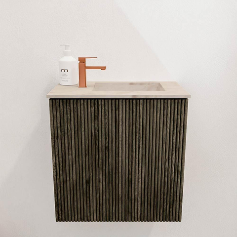 Het meubel valt direct op door zijn moderne, strakke lijnen en de warme kleur Shadow die een natuurlijke sfeer oproept. De verticale groeven in de deur geven het meubel een subtiele textuur die het design net dat beetje extra geeft. Hierdoor past het moeiteloos in zowel moderne als klassieke badkamers. De wastafel in de kleur Frappe sluit hier perfect bij aan en zorgt voor een zachte, uitnodigende uitstraling. Met dit meubel kies je voor een tijdloos design dat jarenlang meegaat en je badkamer een luxe uitstraling geeft.