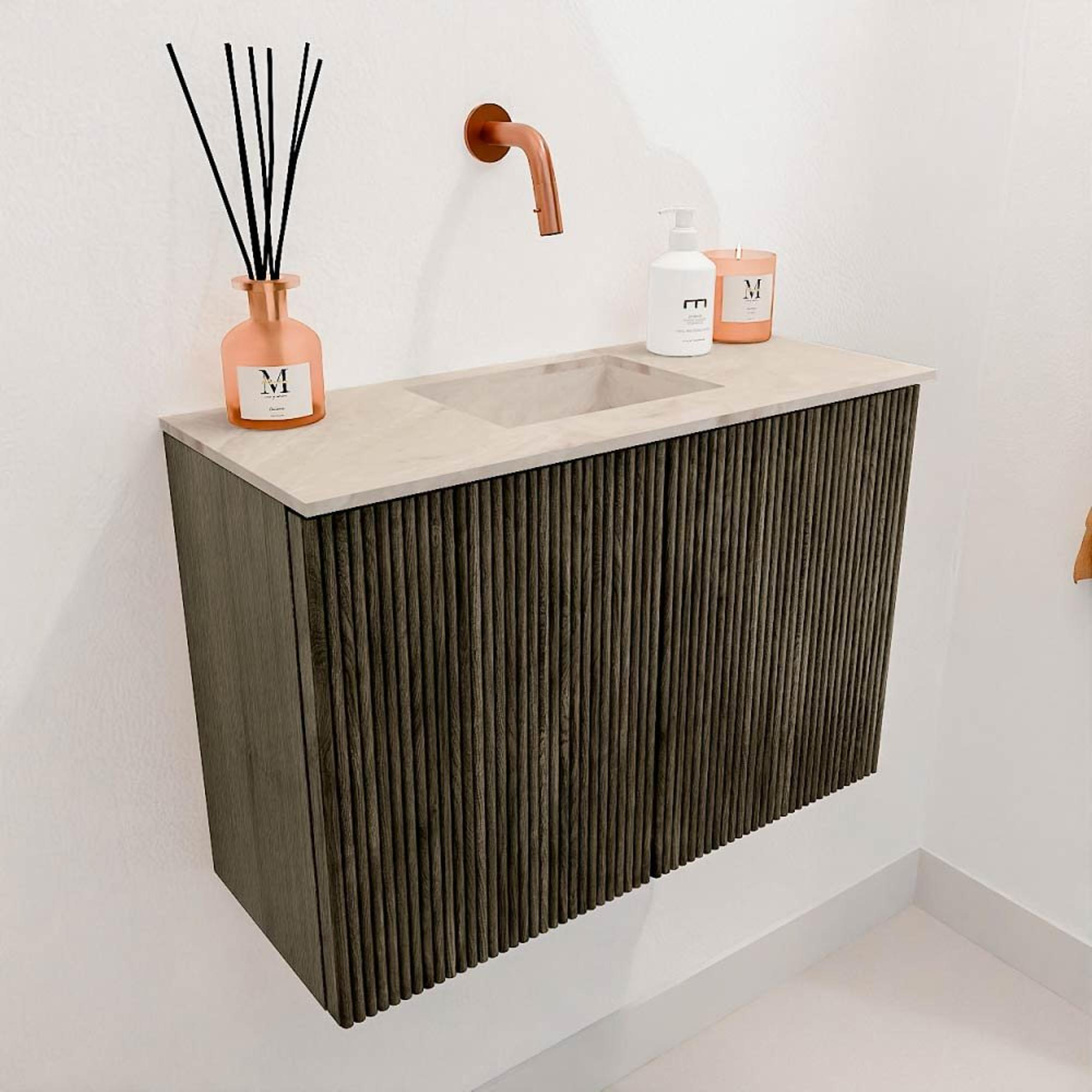 Het meubel valt direct op door zijn elegante uitstraling, dankzij de combinatie van massief eikenhout en eikenfineer in de kleur Shadow. De verticale ribbels geven het front een unieke textuur en zorgen voor een speels doch strak effect. Deze stijlvolle details maken het meubel tot een blikvanger in jouw badkamer, zonder te overheersen. Door het subtiele kleurcontrast met de Frappe wastafel ontstaat een harmonieuze sfeer die rust en klasse uitstraalt. Zo voeg je niet alleen een functioneel element toe, maar ook een designstuk dat jouw badkamer naar een hoger niveau tilt.