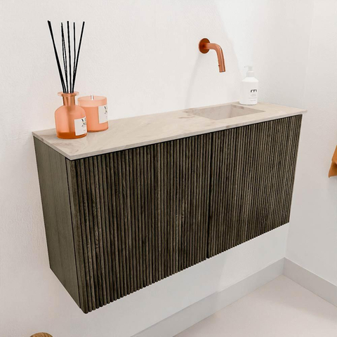 De combinatie van de warme Shadow-kleur en het subtiele verticale ribbelpatroon geeft het meubel een verfijnde uitstraling die moeiteloos in verschillende interieurstijlen past. Of je nu houdt van modern minimalisme of een meer natuurlijke look, dit meubel voegt altijd een vleugje elegantie toe. De wastafel met zijn rechte positie zorgt voor een harmonieuze balans en maakt het geheel bijzonder uitnodigend. Zo creëer je een badkamer die niet alleen functioneel is, maar ook een echte blikvanger.