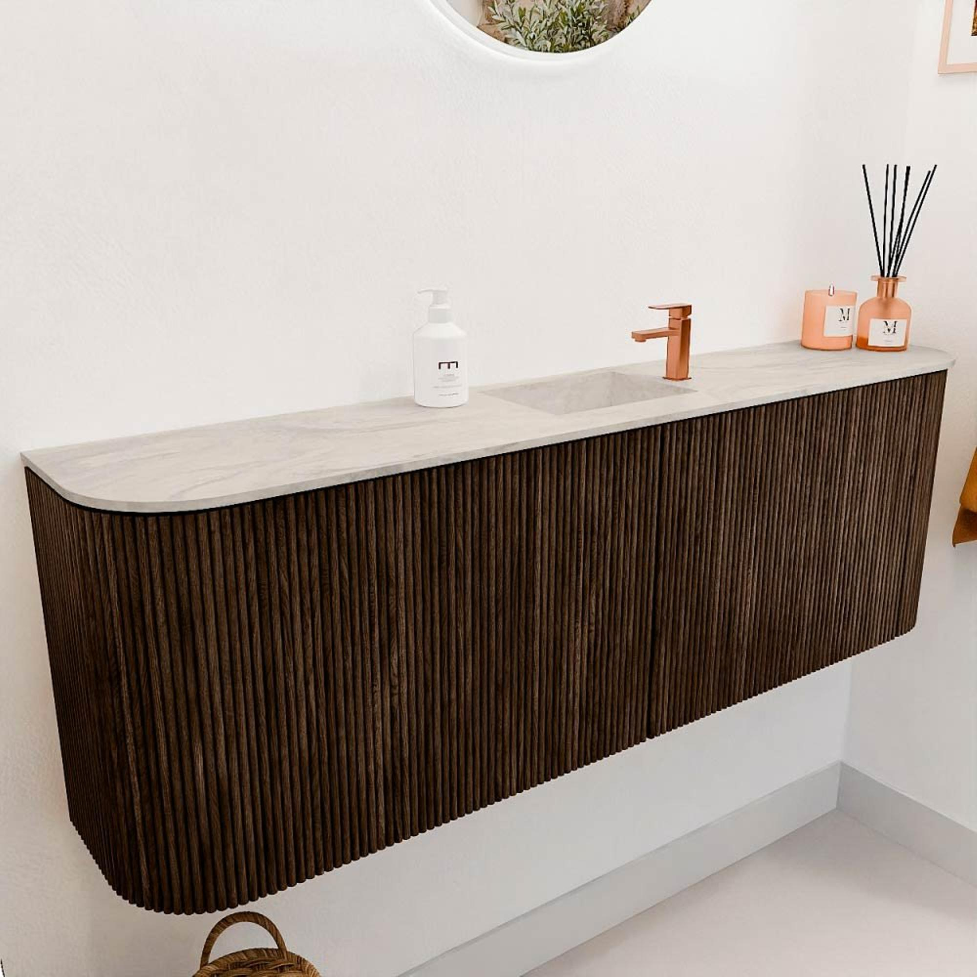 De combinatie van echt walnoothout met een moderne, minimalistische vormgeving maakt dit meubel tot een stijlvolle aanwinst. De subtiele rondingen aan de linker- en rechterzijde zorgen voor een zachte, organische uitstraling, terwijl de verticale groeven een eigentijdse twist geven. Dit meubel past moeiteloos in diverse interieurstijlen, van klassiek tot modern. Door de warme houttinten creëer je een natuurlijke sfeer die je badkamer direct uitnodigender maakt. Bovendien zorgt het ontwerp ervoor dat het meubel een echte eyecatcher wordt zonder te overheersen.