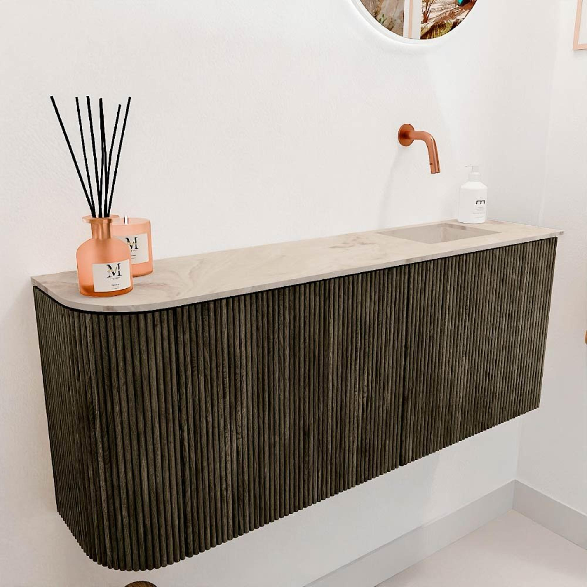 De combinatie van massief eikenhout aan de voorkant en eikenfineer aan de zijkanten geeft dit meubel een natuurlijke en luxe uitstraling. De warme Shadow-kleur voegt een moderne twist toe, waardoor het meubel moeiteloos in diverse badkamerstijlen past. Door de subtiele ronding aan de linkerkant krijgt het geheel een speels en uniek karakter. Zo creëer je een badkamer die niet alleen functioneel is, maar ook echt uitnodigt om te ontspannen en te genieten.